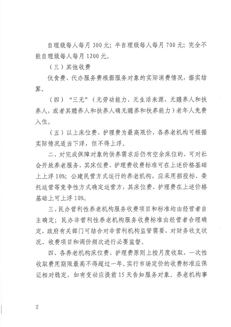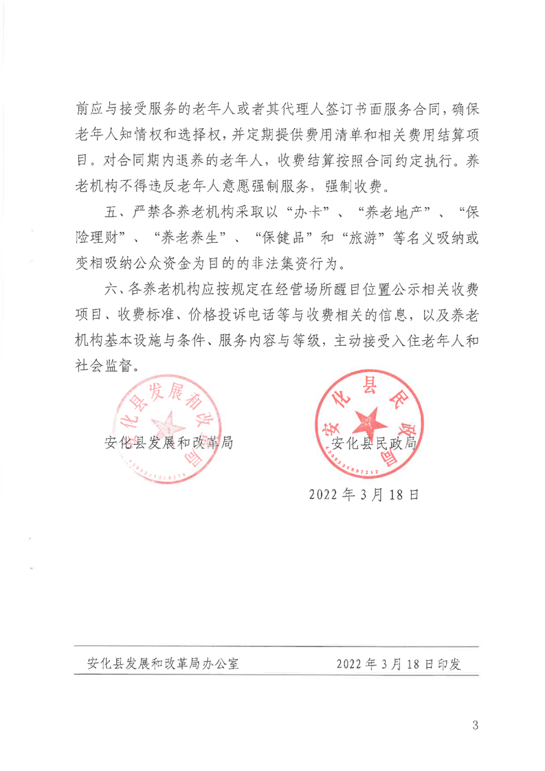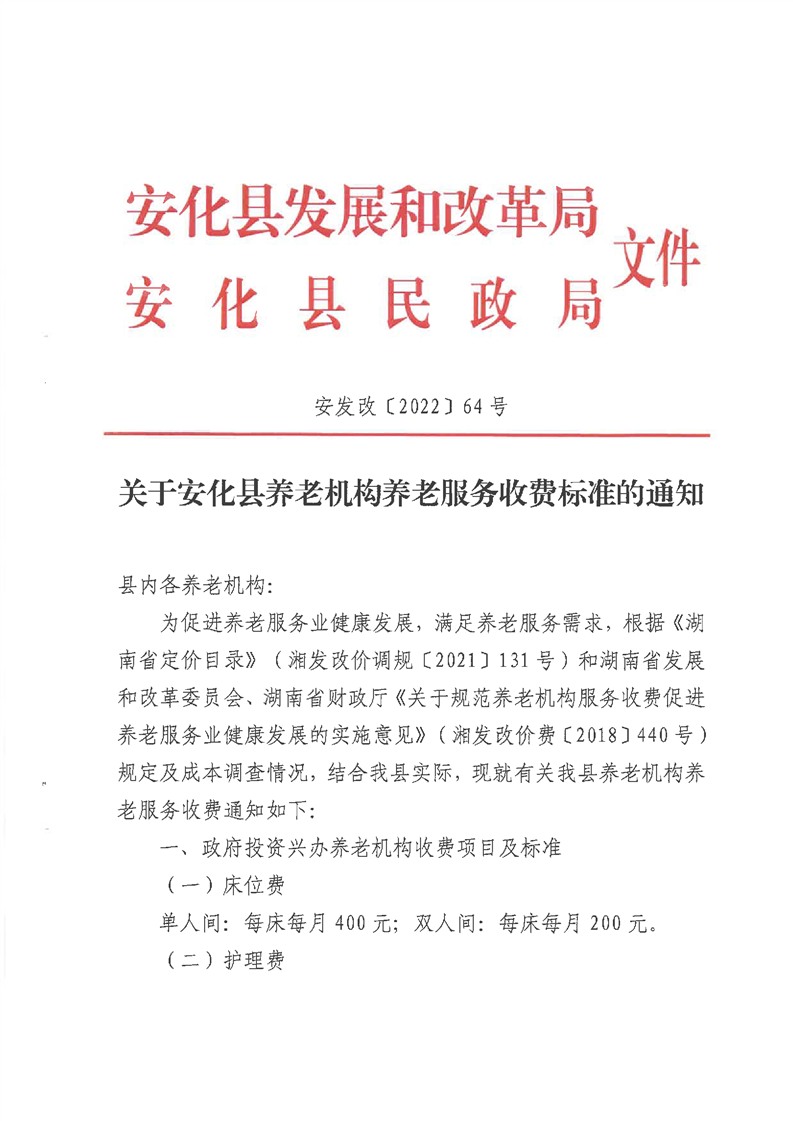 关于安化县养老机构养老服务收费标准的通知