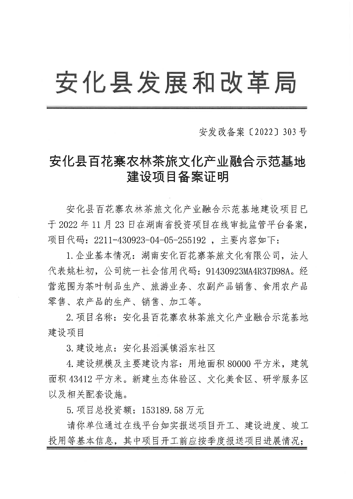 安化县百花寨农林茶旅文化产业融合示范基地建设项目备案证明