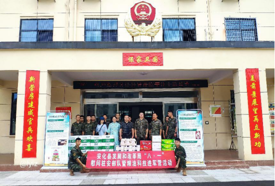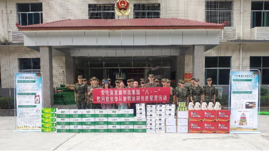 7月29日,安化县发展和改革局党组成员、县优办主任黄志刚同志带队走进驻安部队,开展“粮油科技进军营”活动,向驻安部队赠送慰问物资,通过粮油科技进军营宣传展架和发放科普宣传册,现场宣传和指导科学储粮,普及粮油营养健康知识,倡导科学营养饮食和爱粮节粮理念。提前为驻安部队官兵送上“八一”建军节的慰问和祝福。