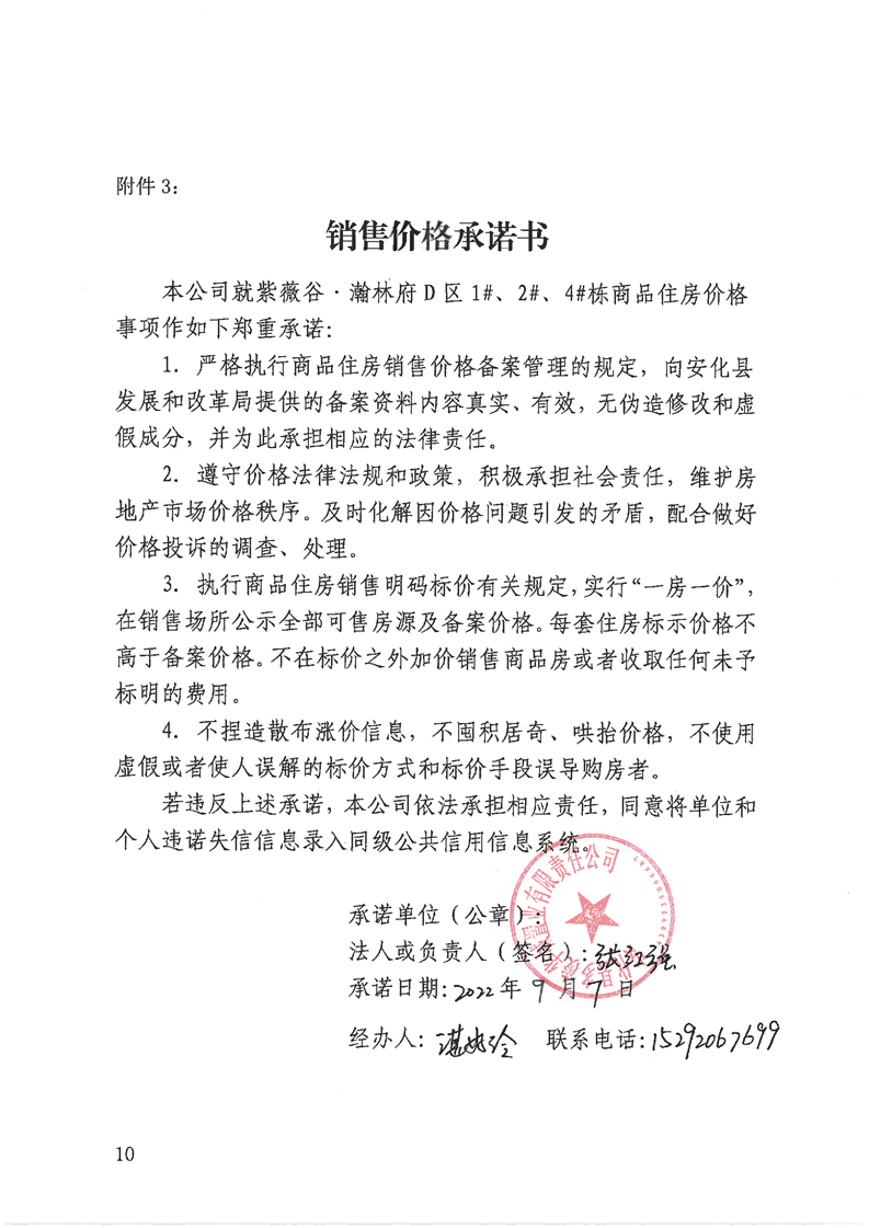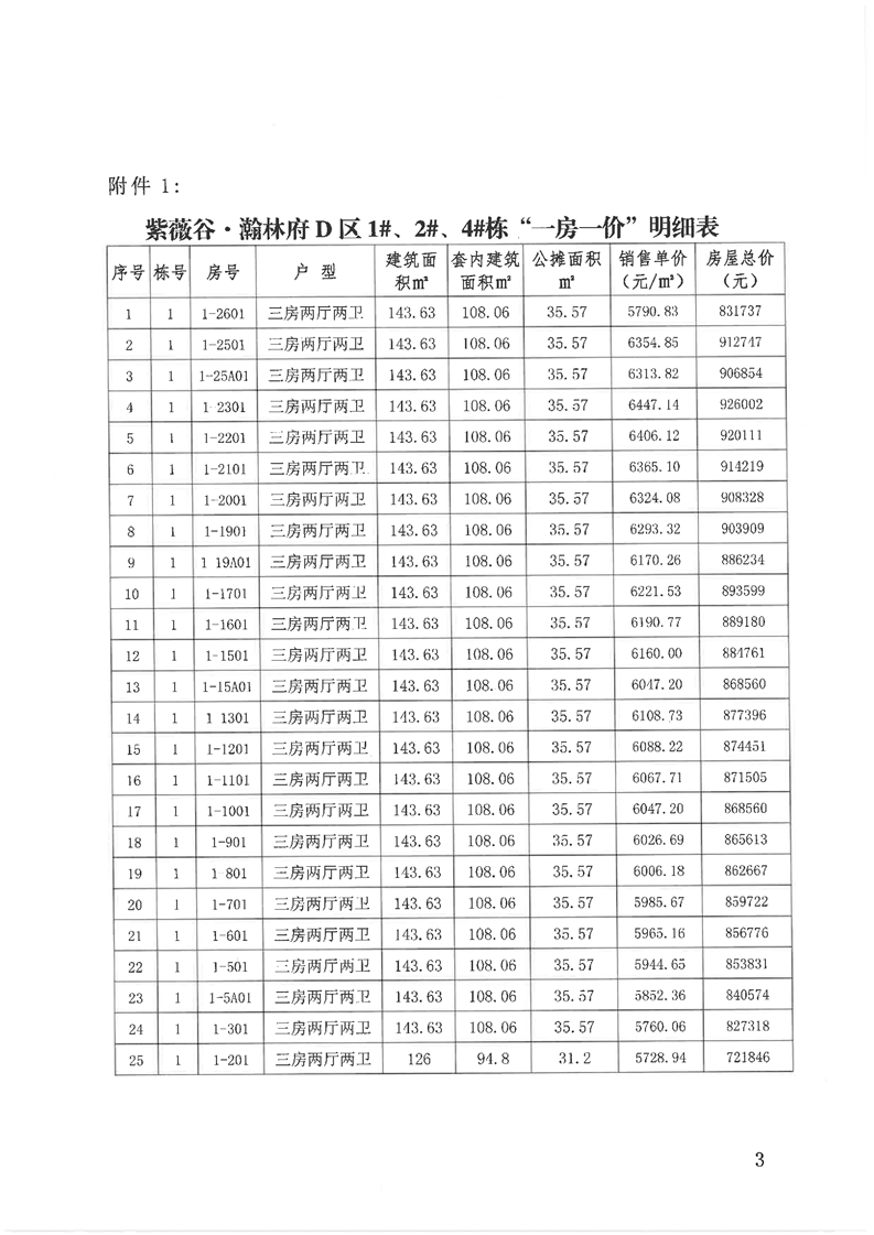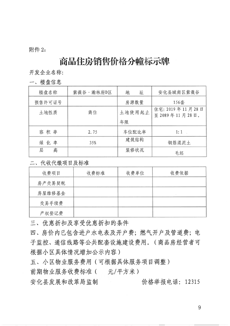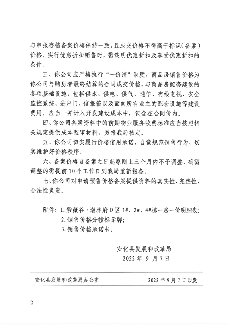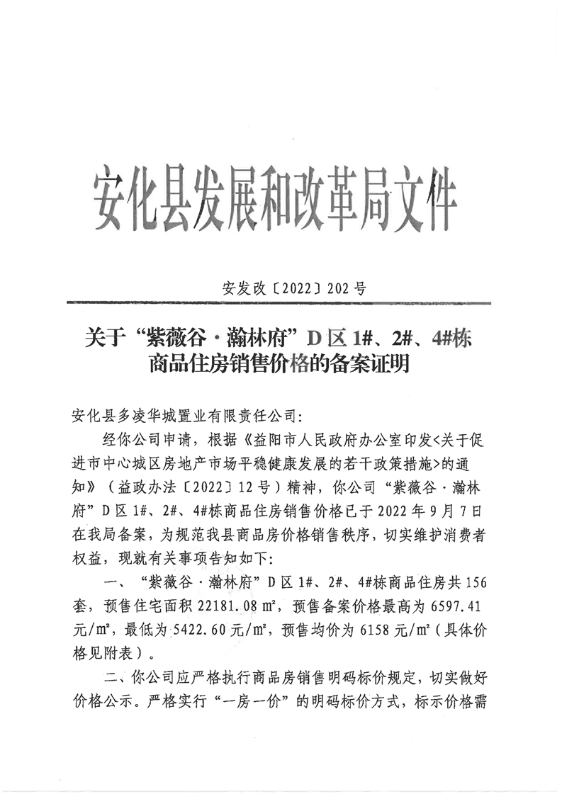 关于“紫薇谷·瀚林府”D区1#、2#、4#栋商品住房销售价格的备案证明