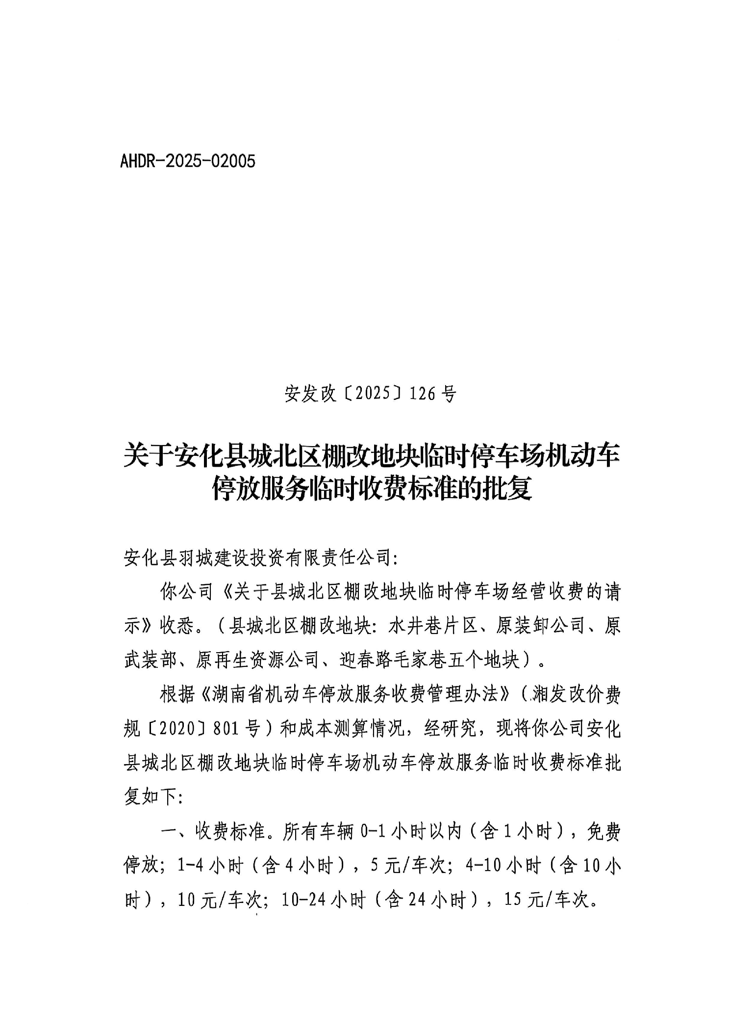关于安化县城北区棚改地块临时停车场机动车停放服务临时收费标准的批复