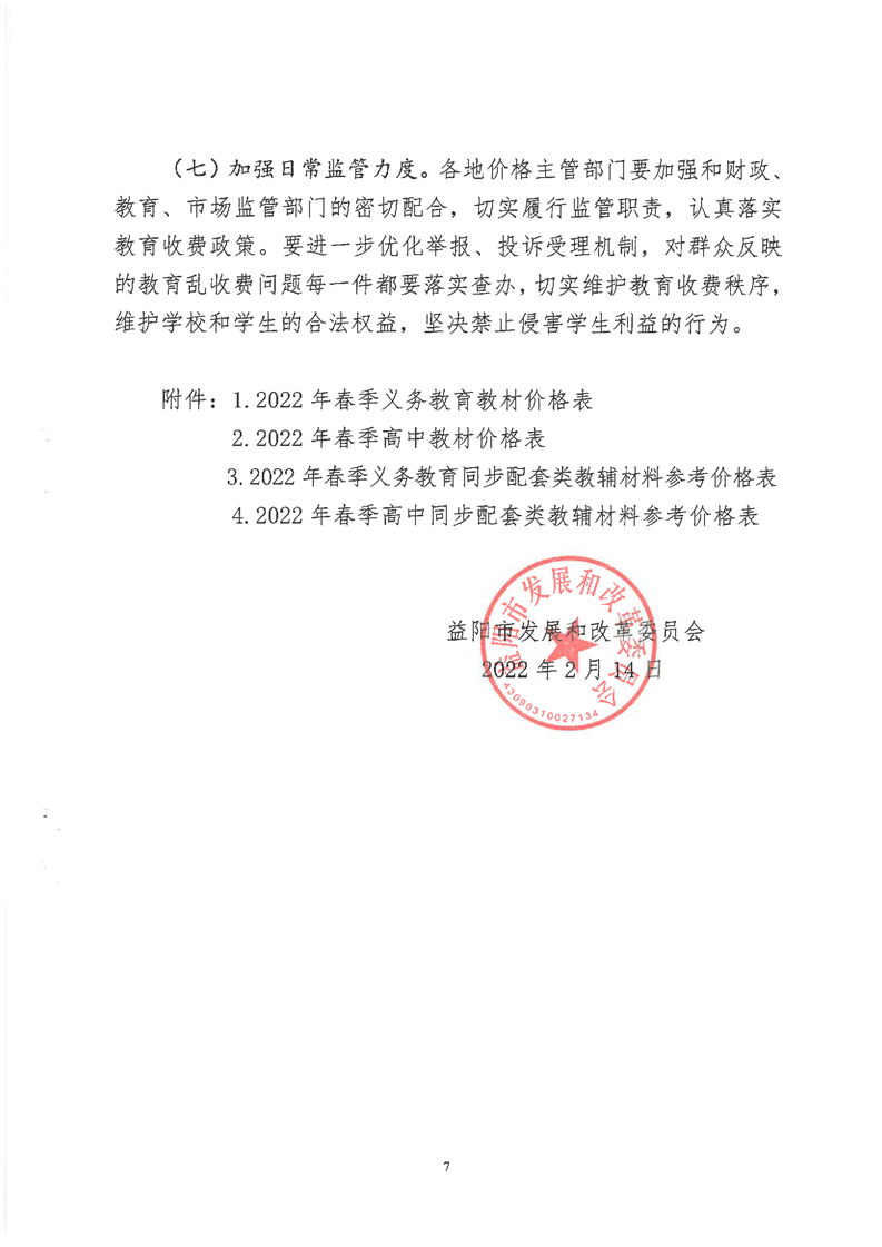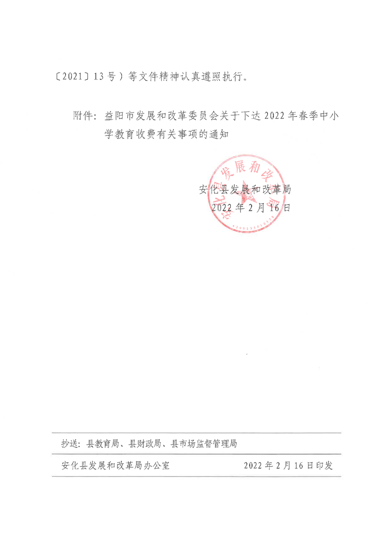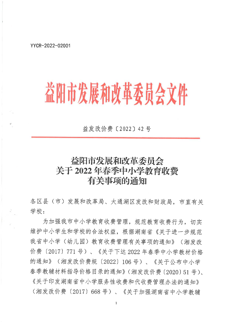 关于转发《益阳市发展和改革委员会关于下达2022年春季中小学教育收费有关事项的通知》的通知