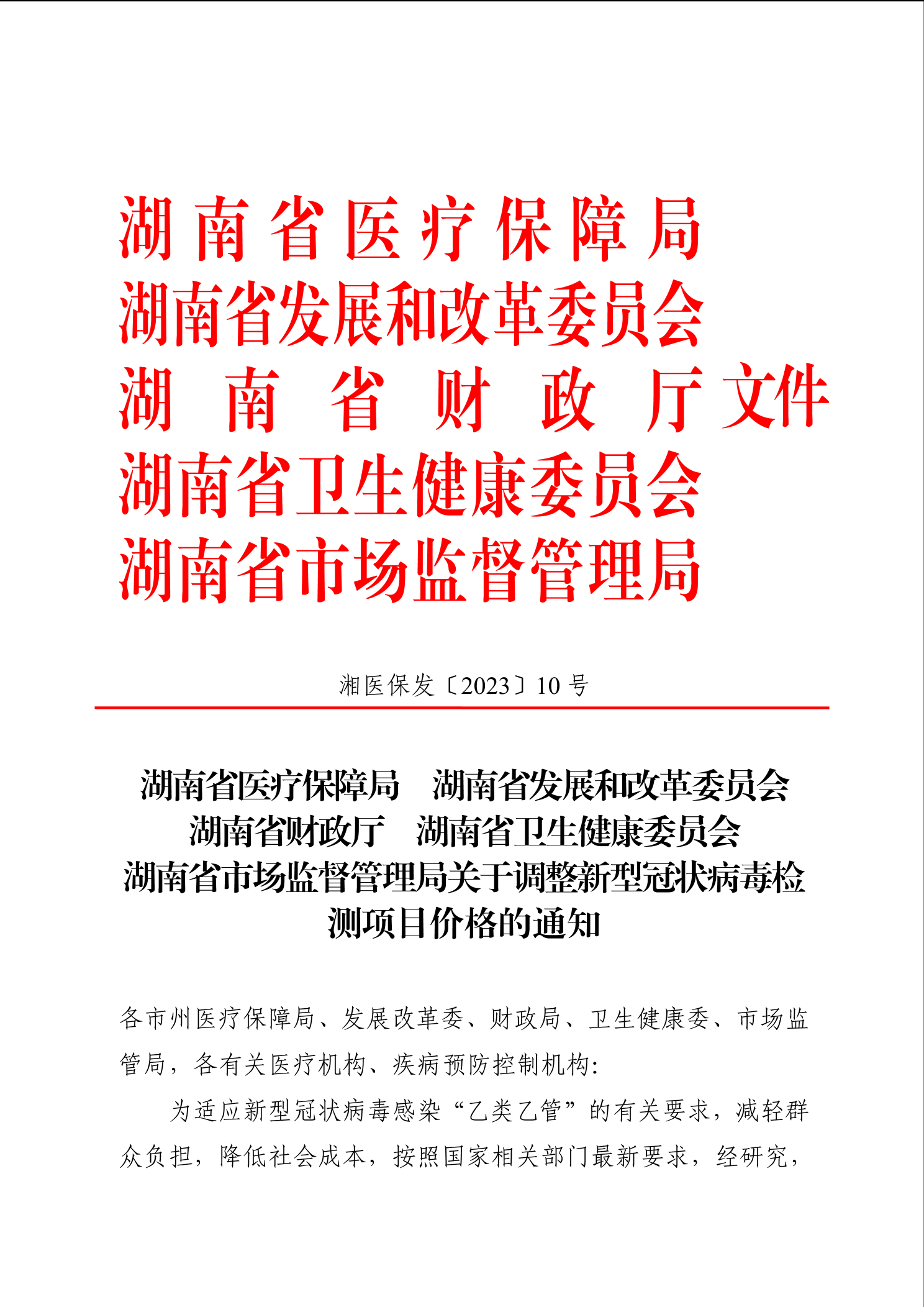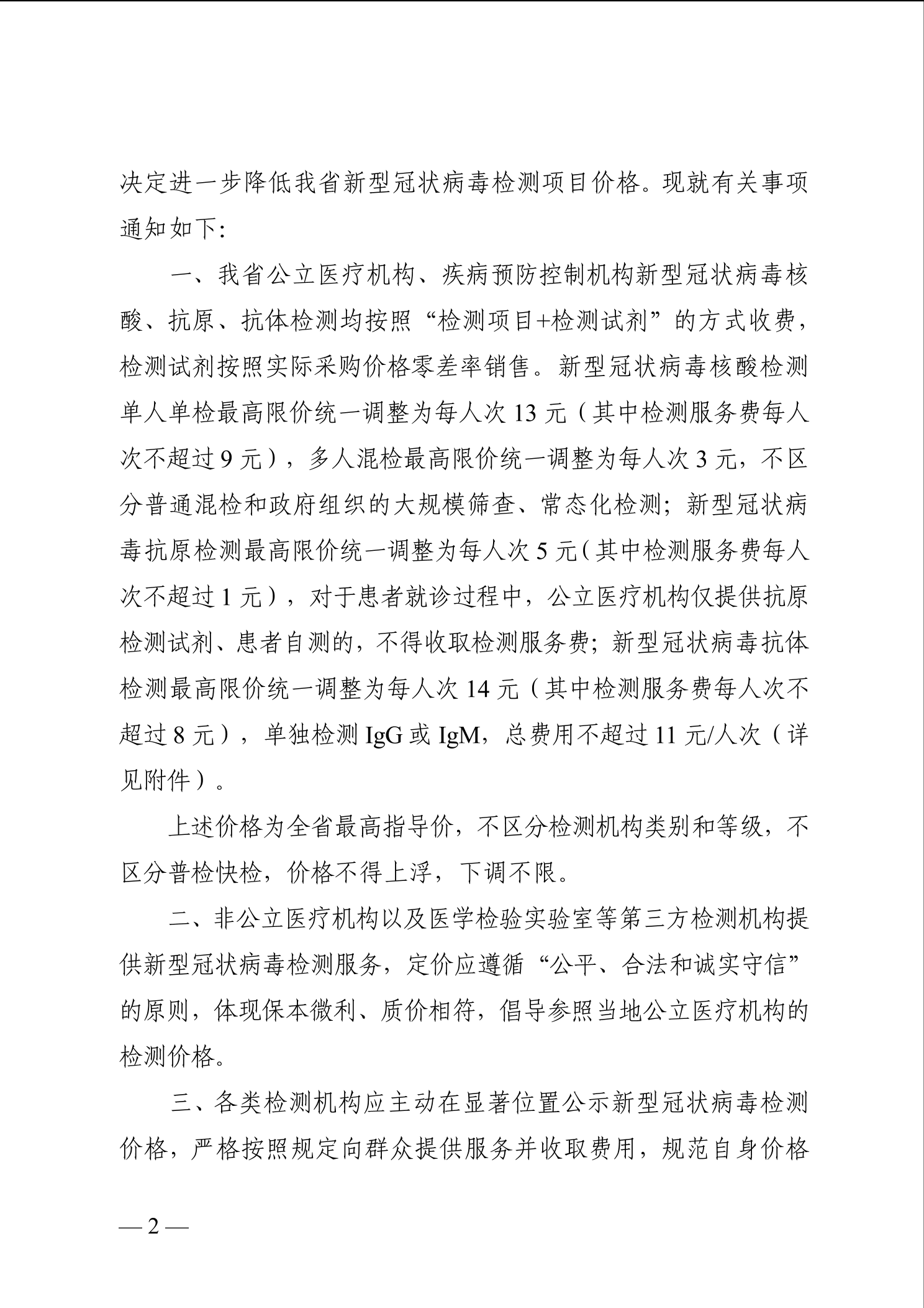 关于调整新型冠状病毒检测项目价格的通知