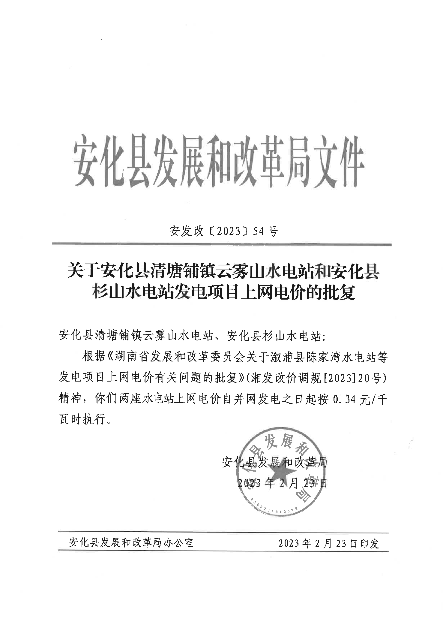 关于安化县清塘铺镇云雾山水电站和安化县杉山水电站发电项目上网电价的批复