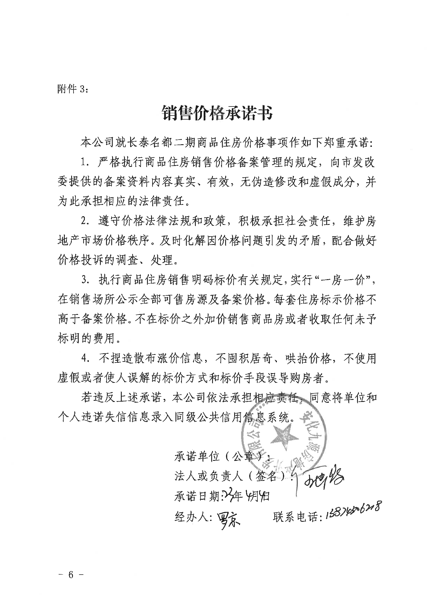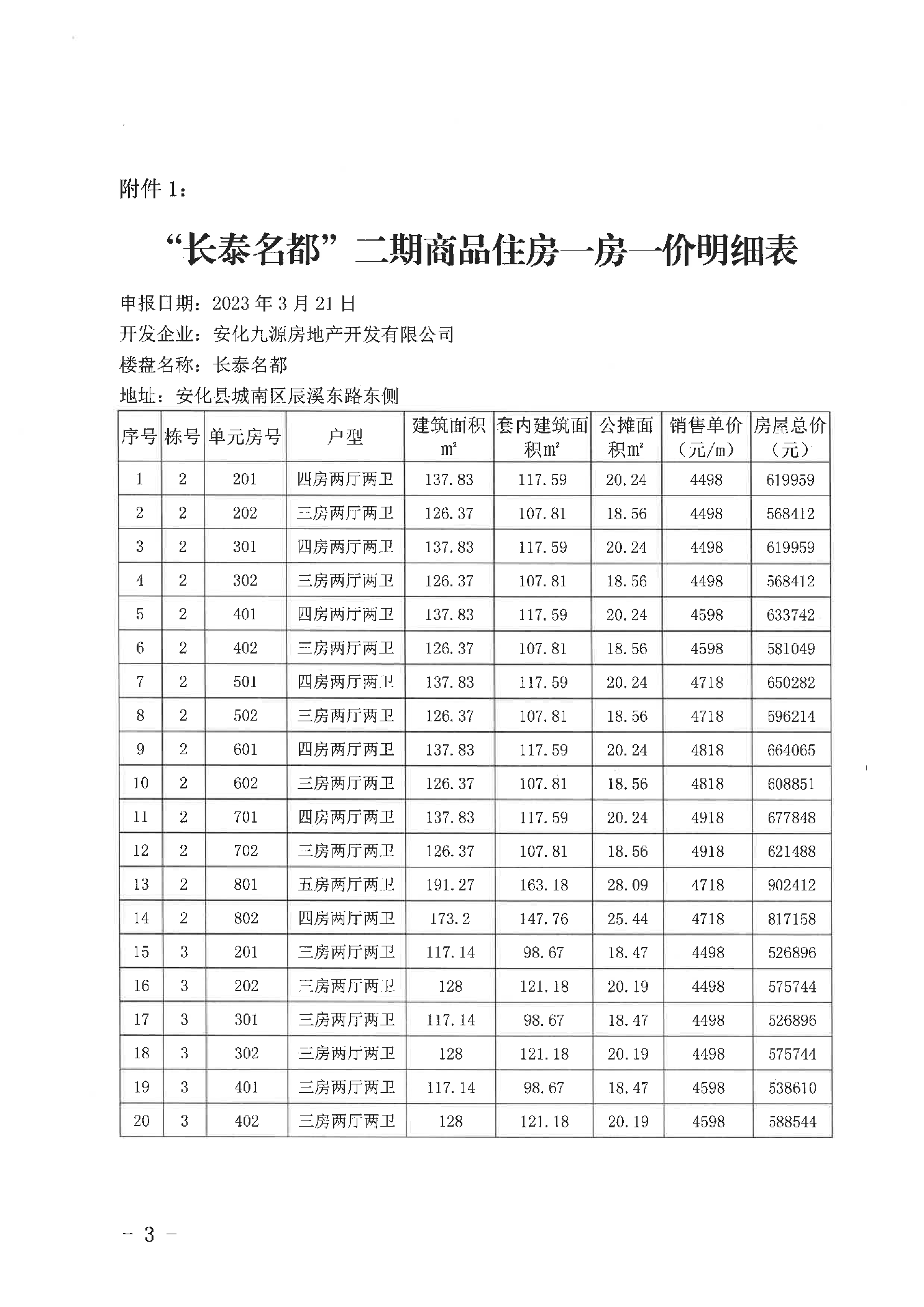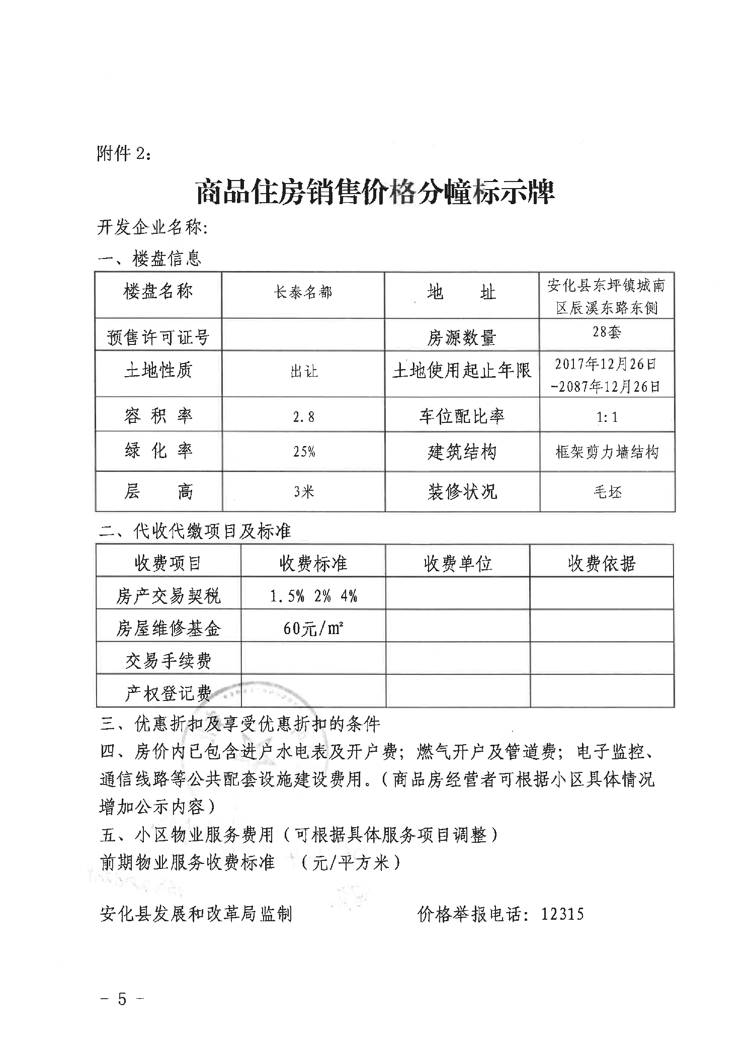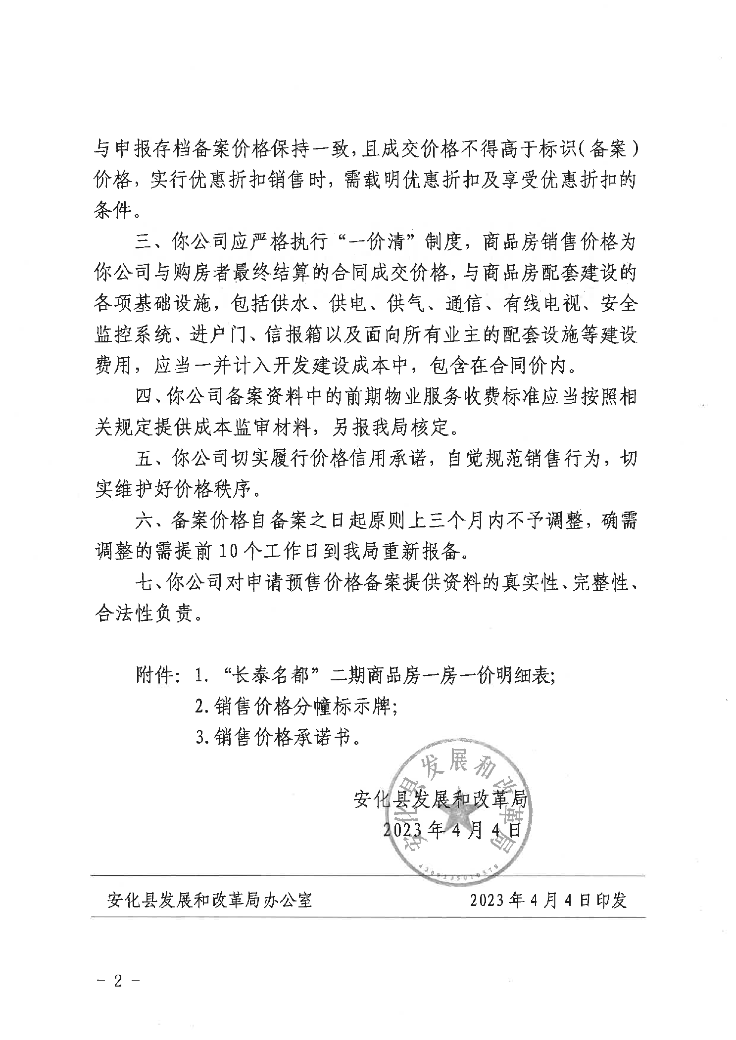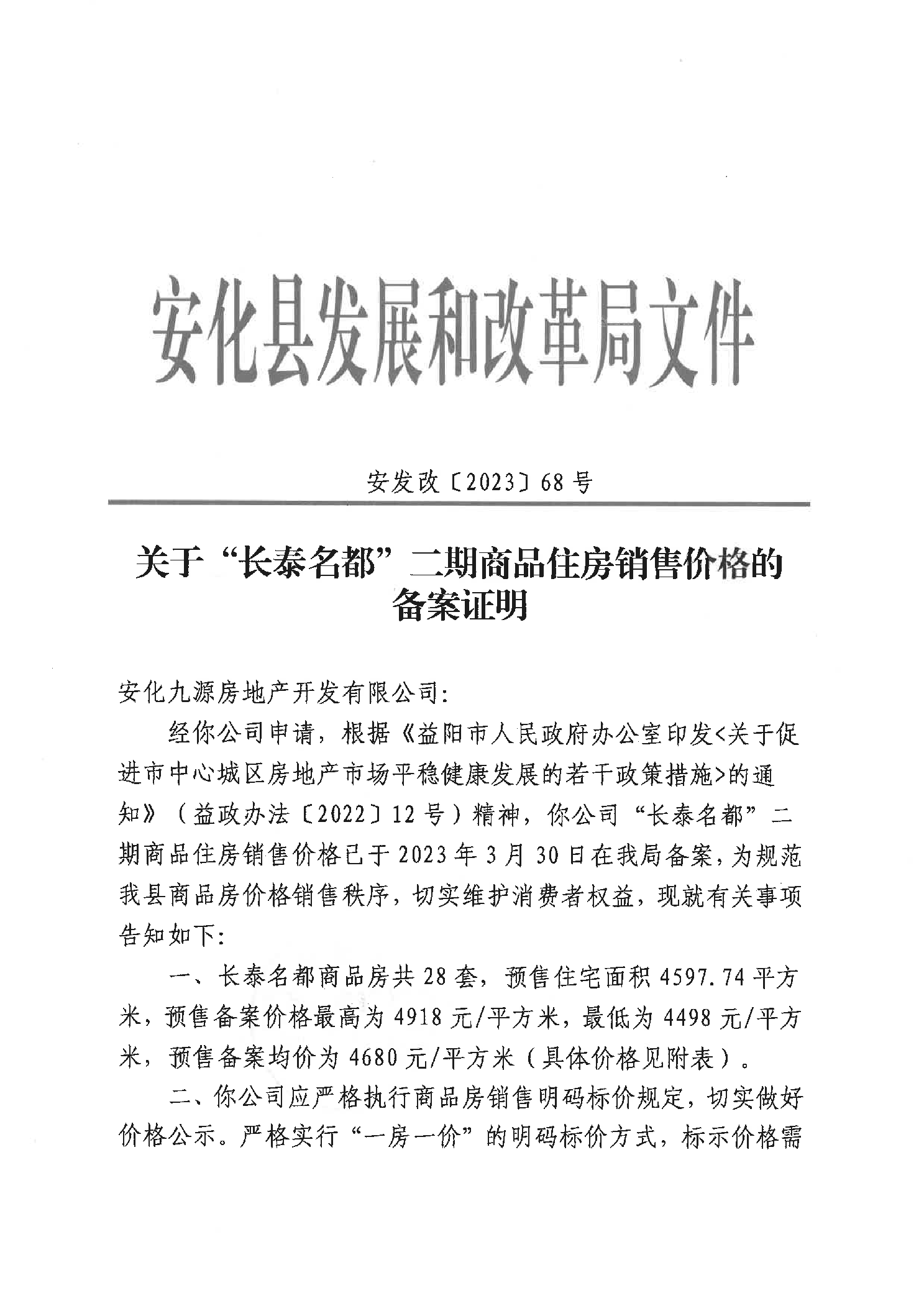 关于“长泰名都”二期商品住房销售价格的备案证明