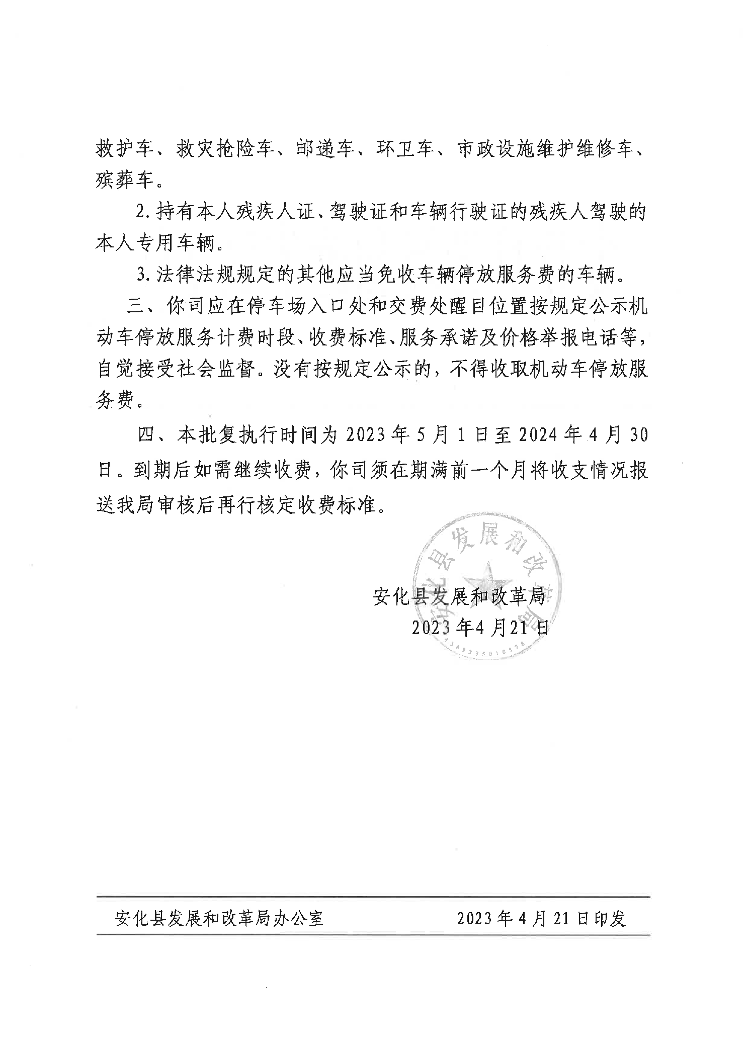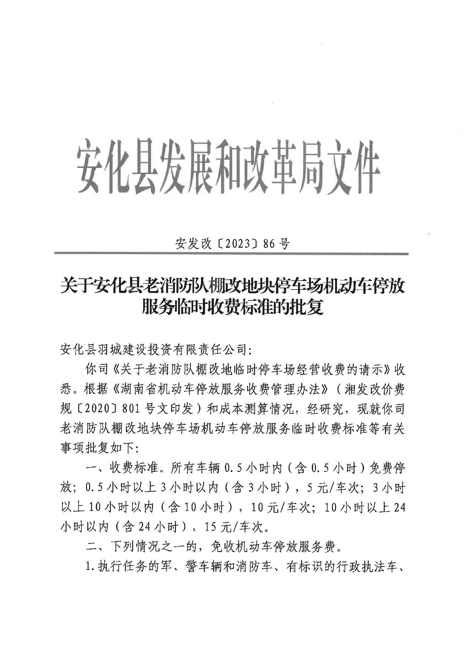 关于安化县老消防队棚改地块停车场机动车停放服务临时收费标准的批复