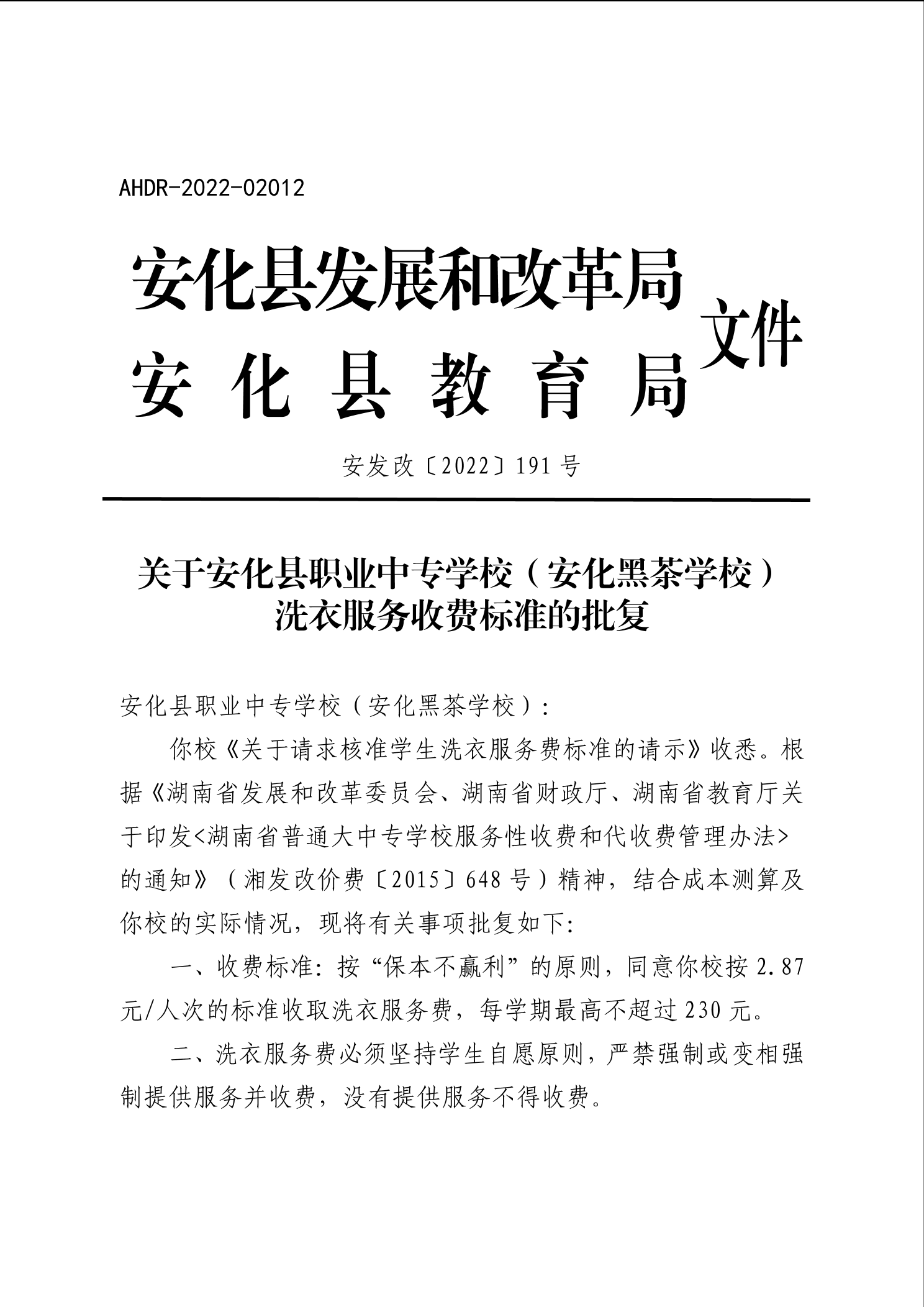关于安化县职业中专学校(安化黑茶学校)洗衣服务收费标准的批复
