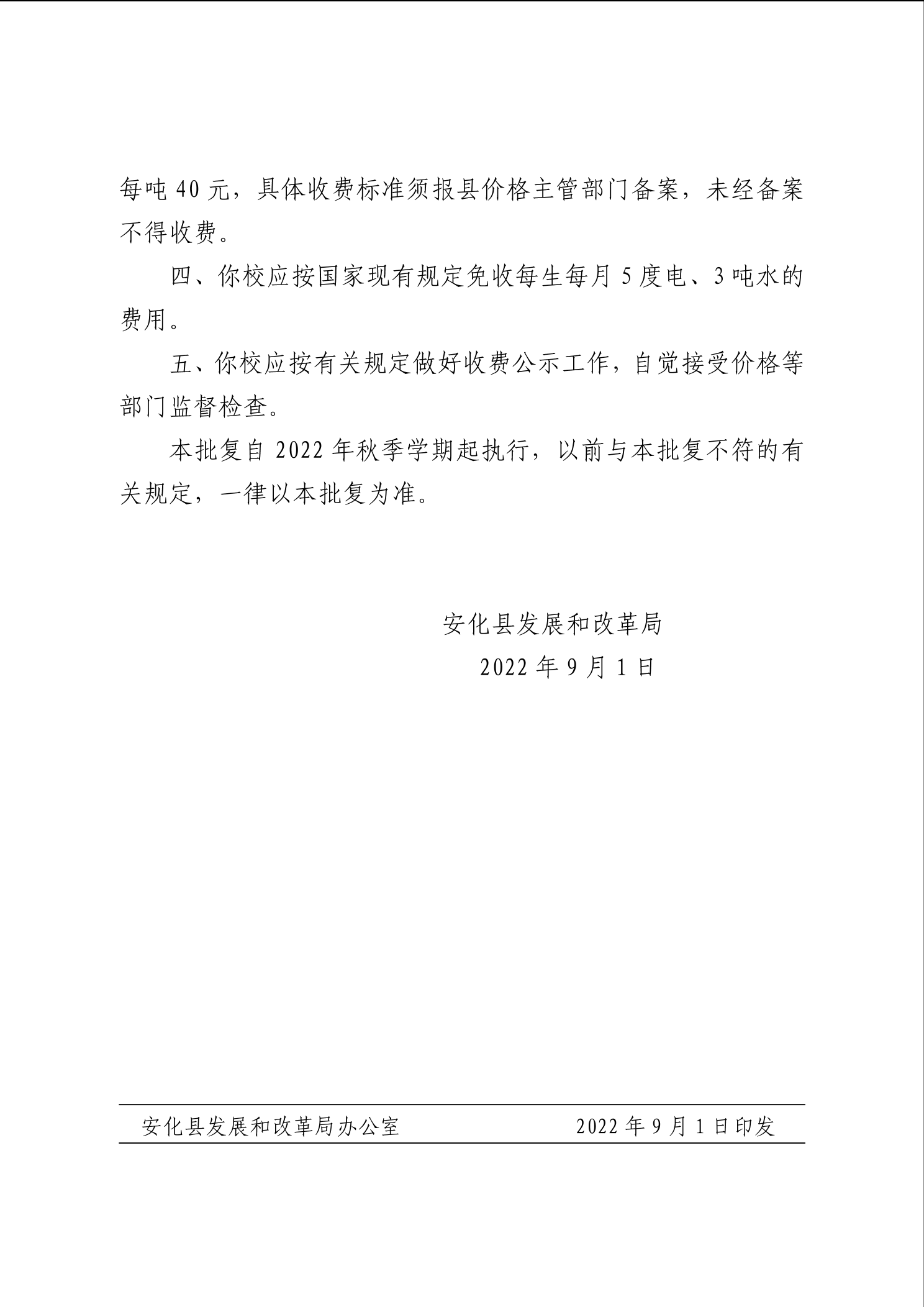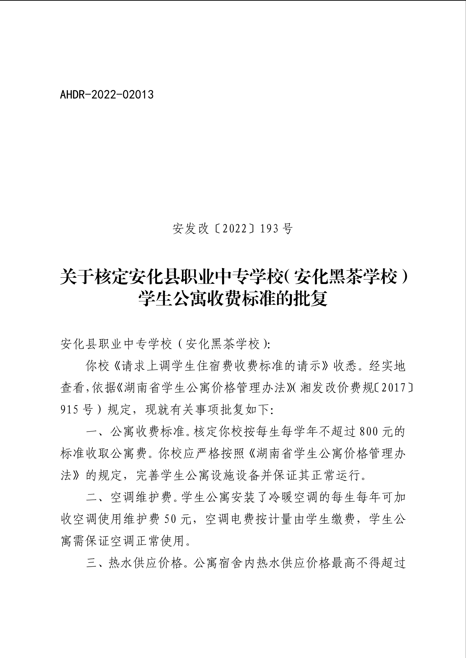 关于核定安化县职业中专学校(安化黑茶学校)学生公寓收费标准的批复