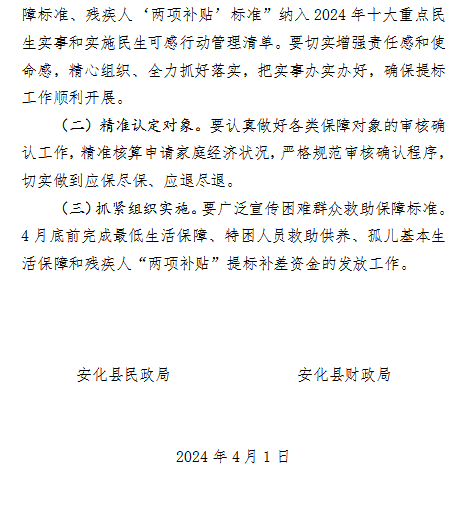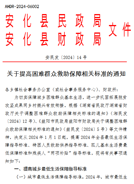 安化县民政局 安化县财政局 关于提高困难群众救助保障相关标准的通知
