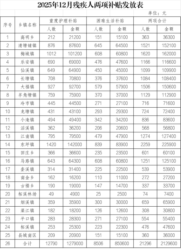 为贯彻落实残疾人两项补贴制度,切实保障残疾人基本权益,现将2025年12月残疾人两项补贴资金发放事项通知如下: