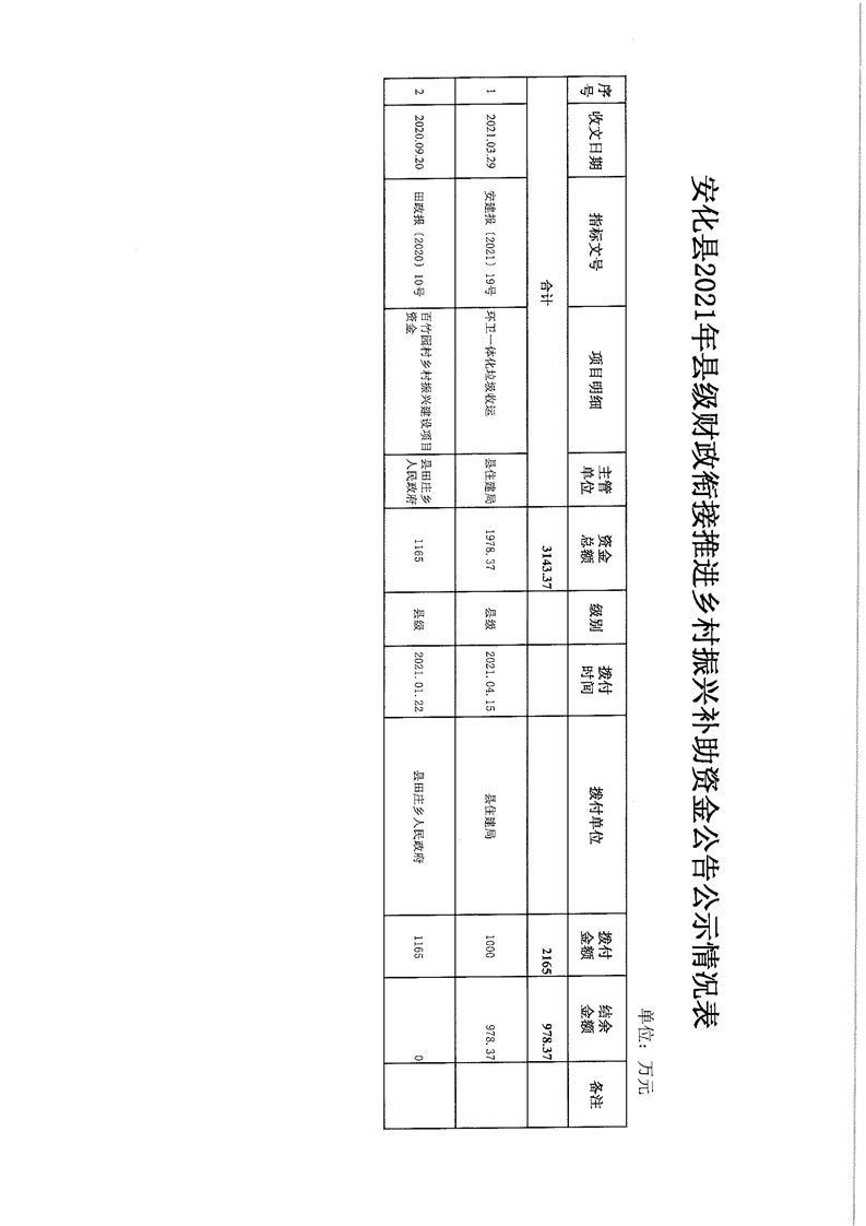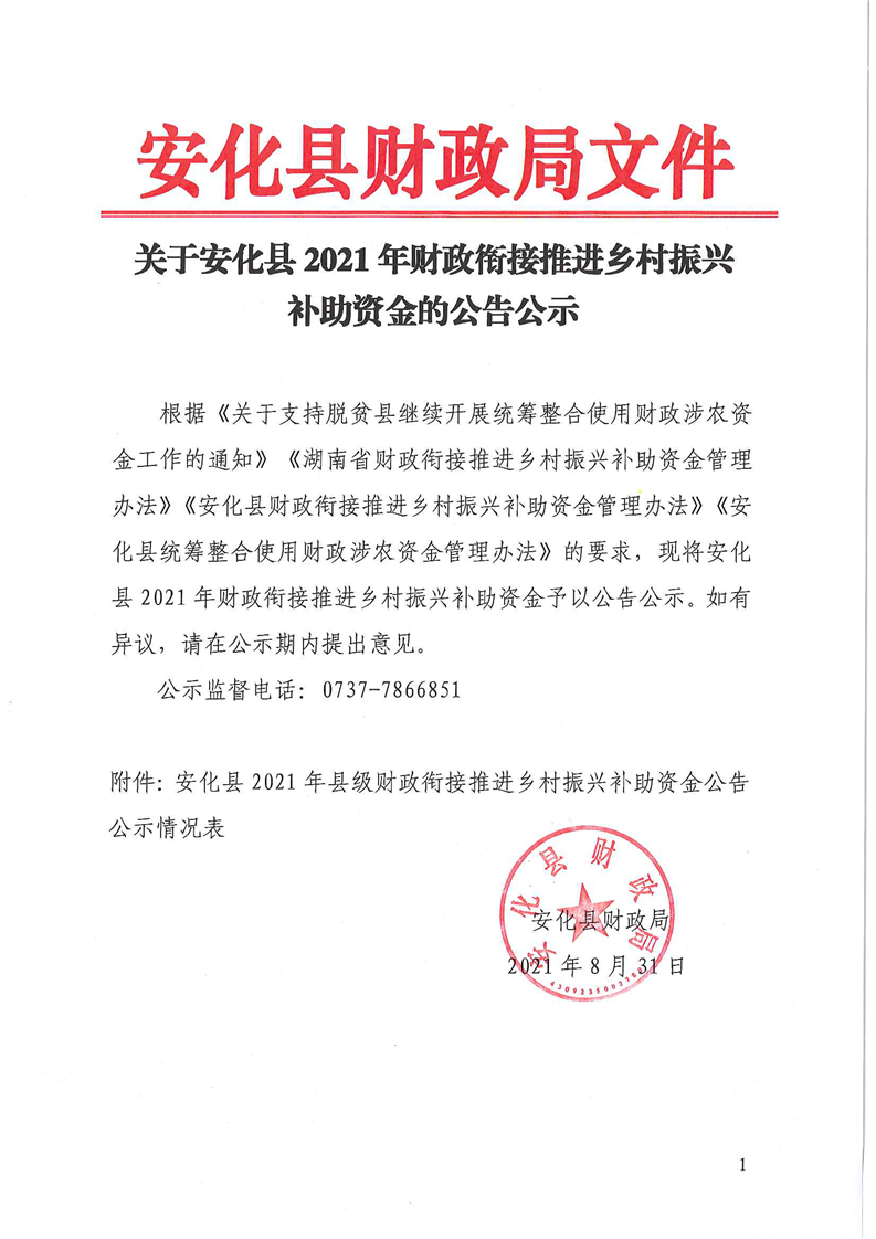 关于安化县2021年财政衔接推进乡村振兴 补助资金的公告公示