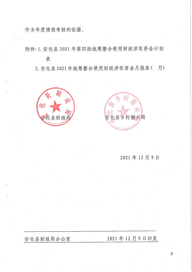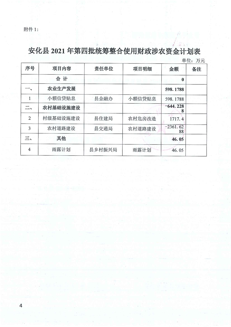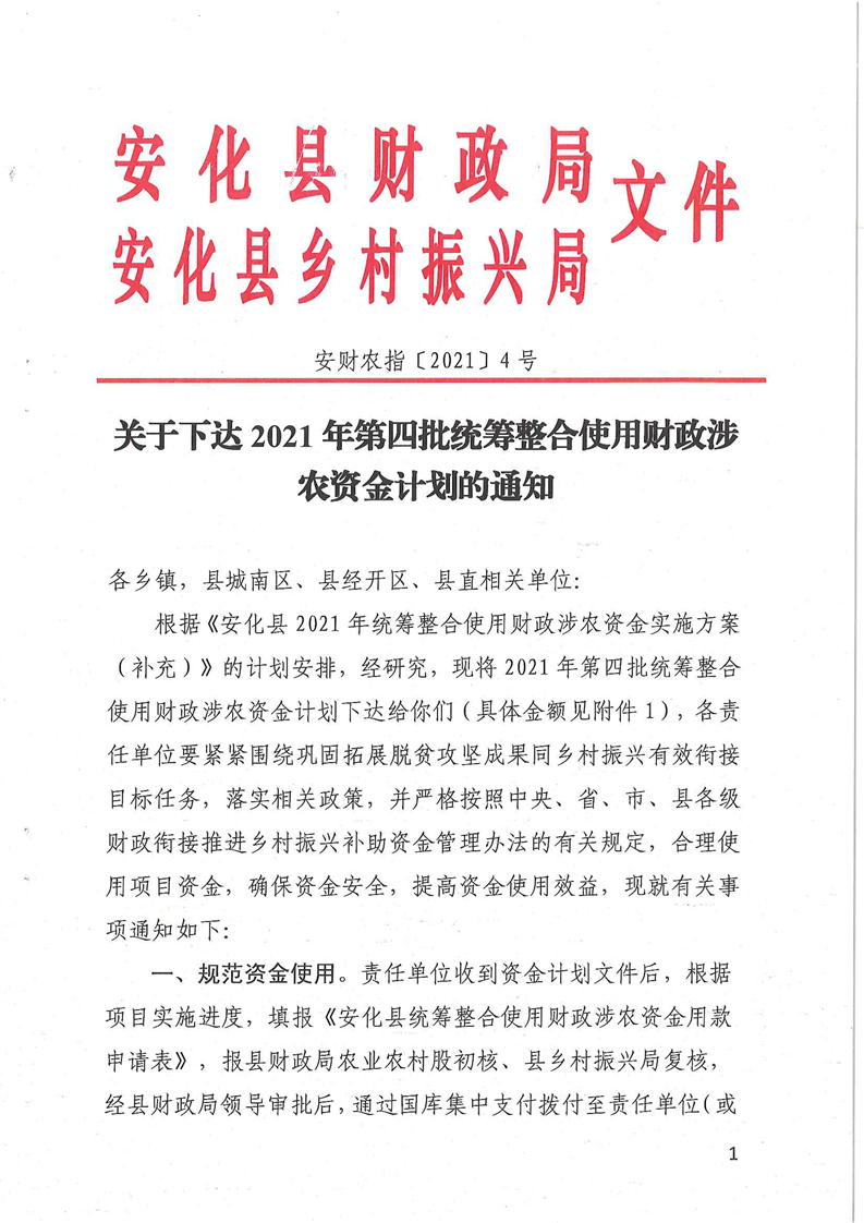 关于下达2021年第四批统筹整合使用财政涉农资金计划的通知(安财农指〔2021〕4号)