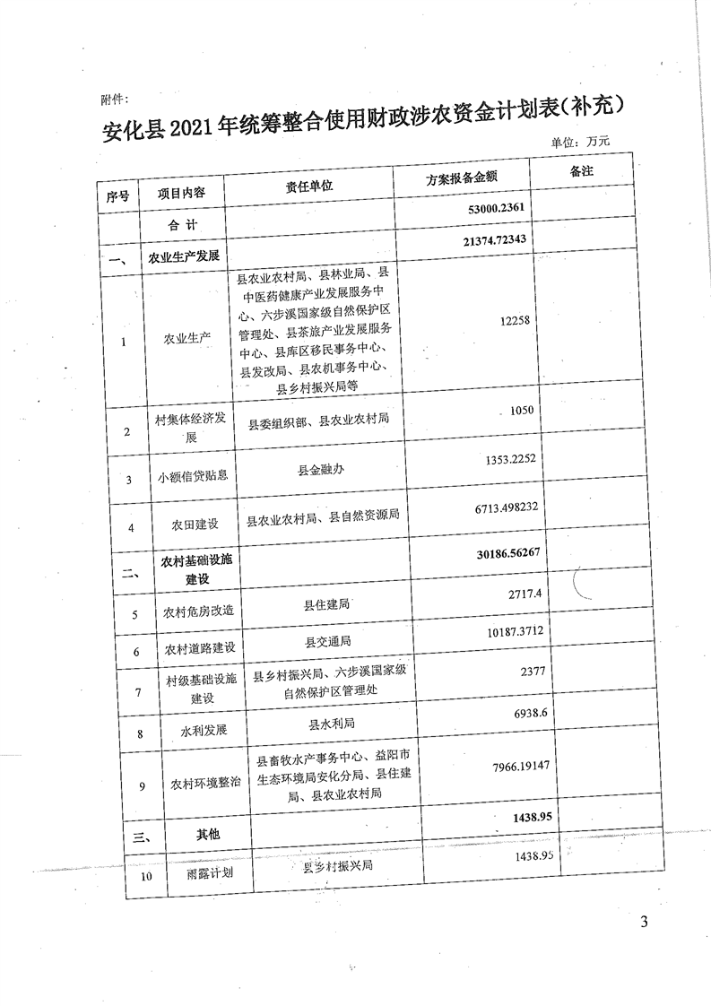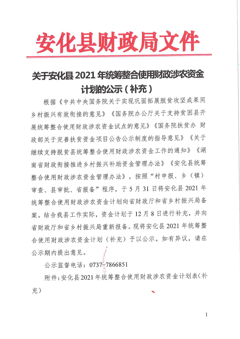 关于安化县2021年统筹整合使用财政涉农资金计划的公示(补充))