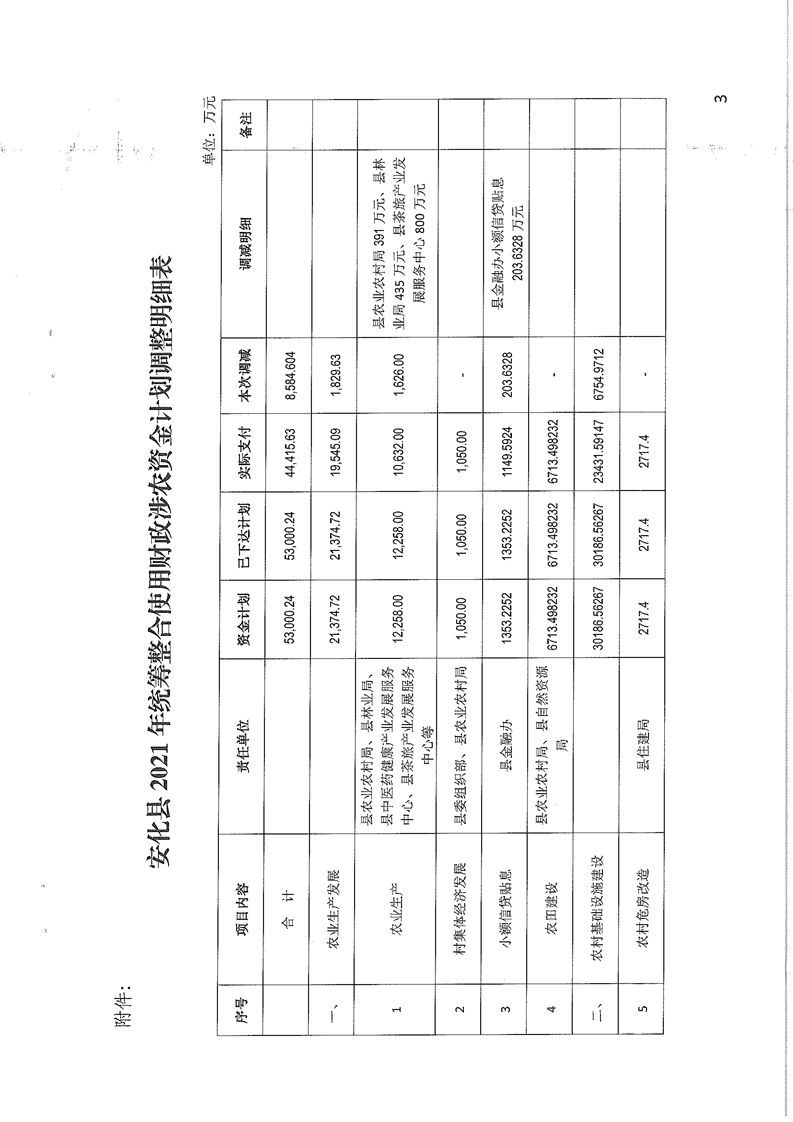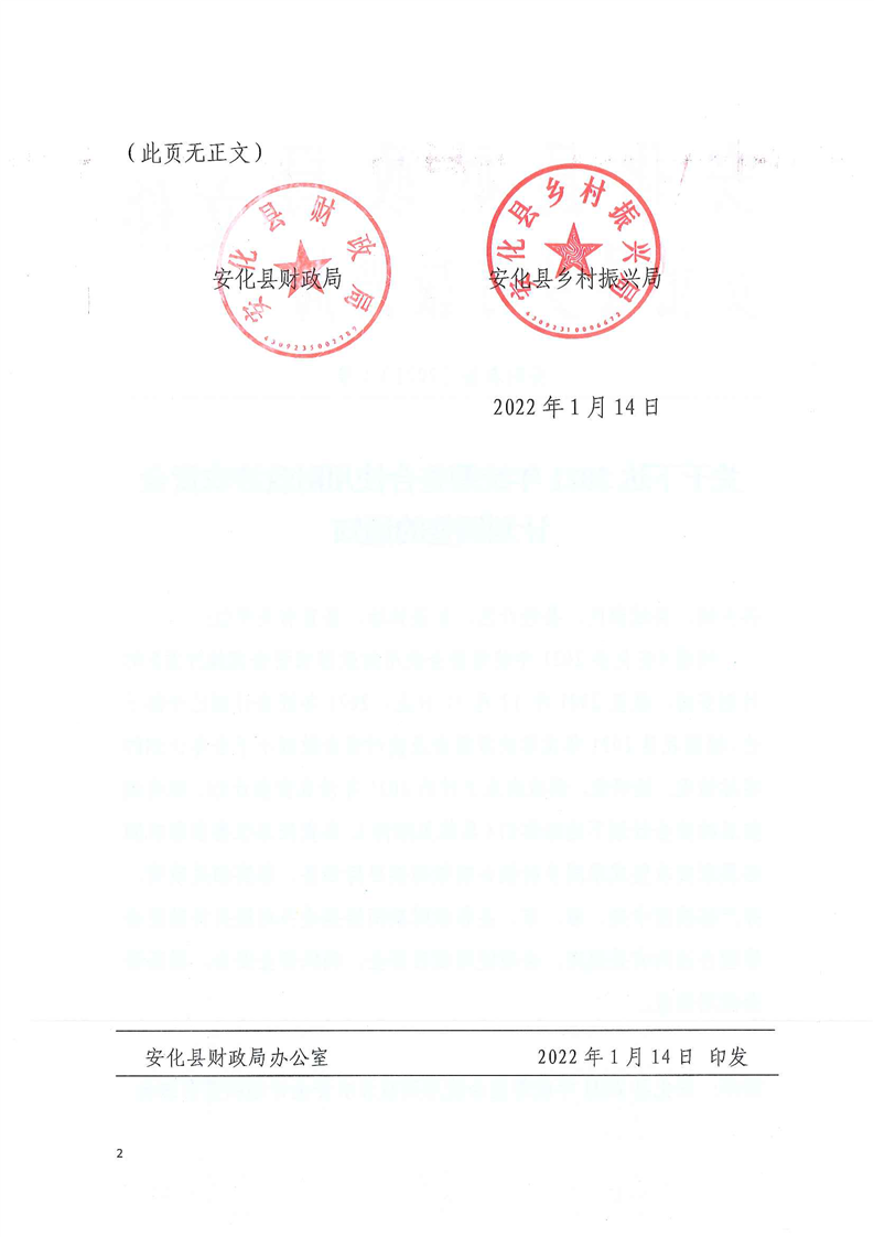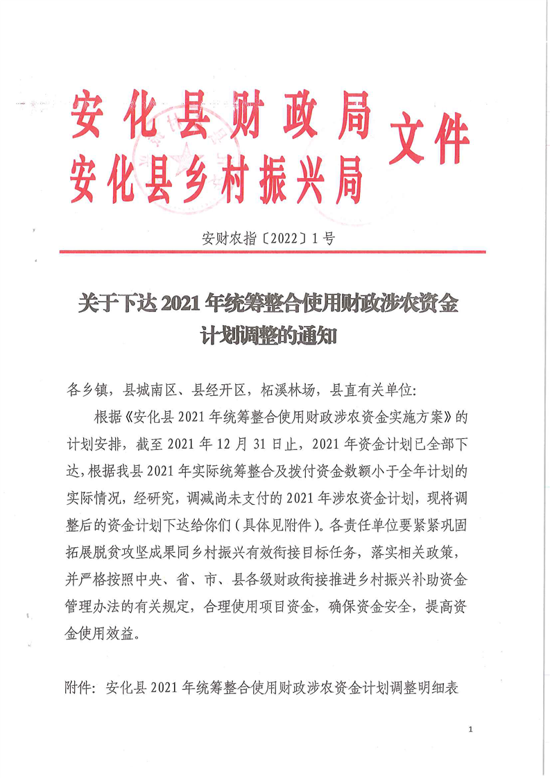 安财农指〔2022〕1号 关于下达2021年统筹整合使用财政涉农资金计划调整的通知