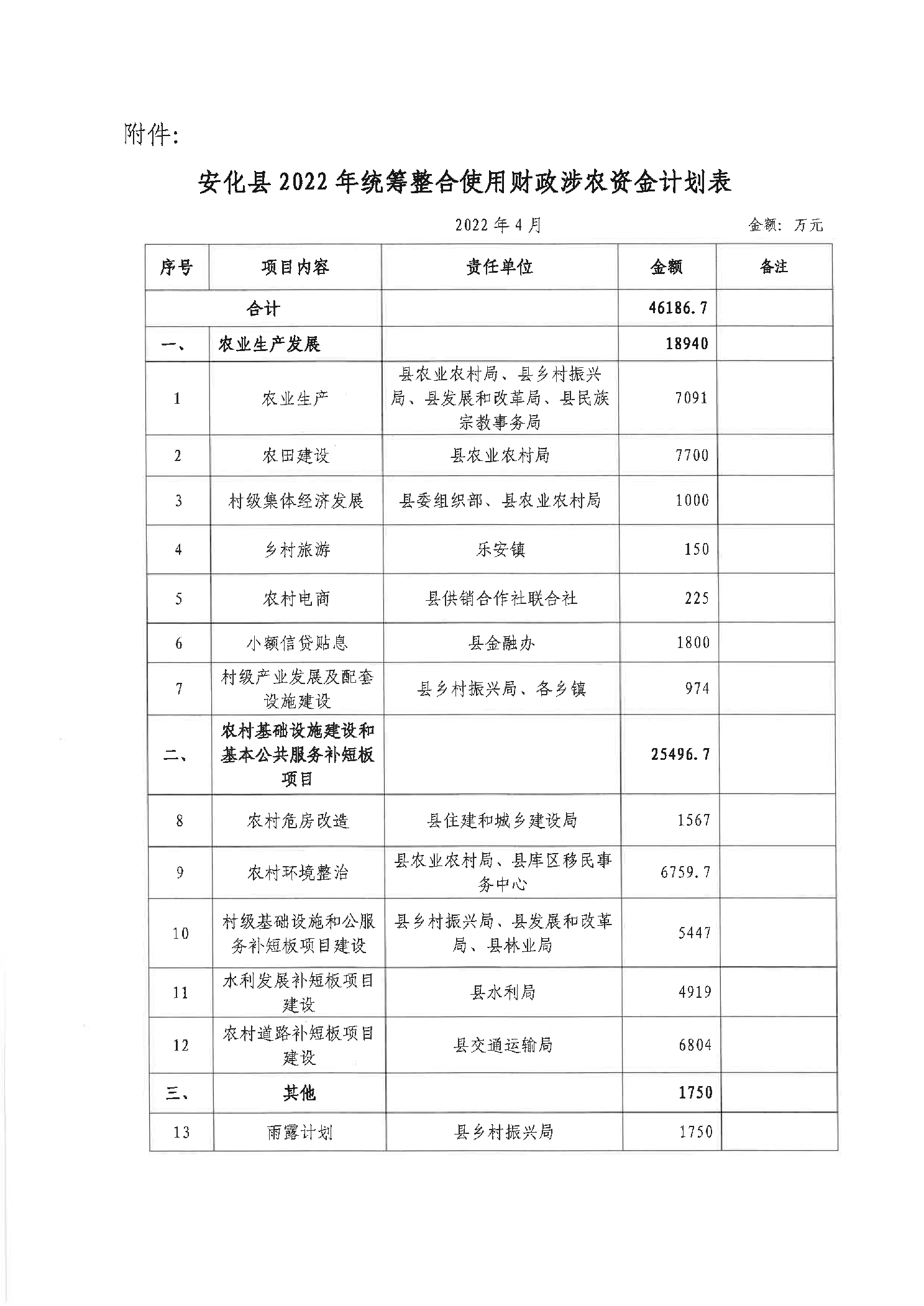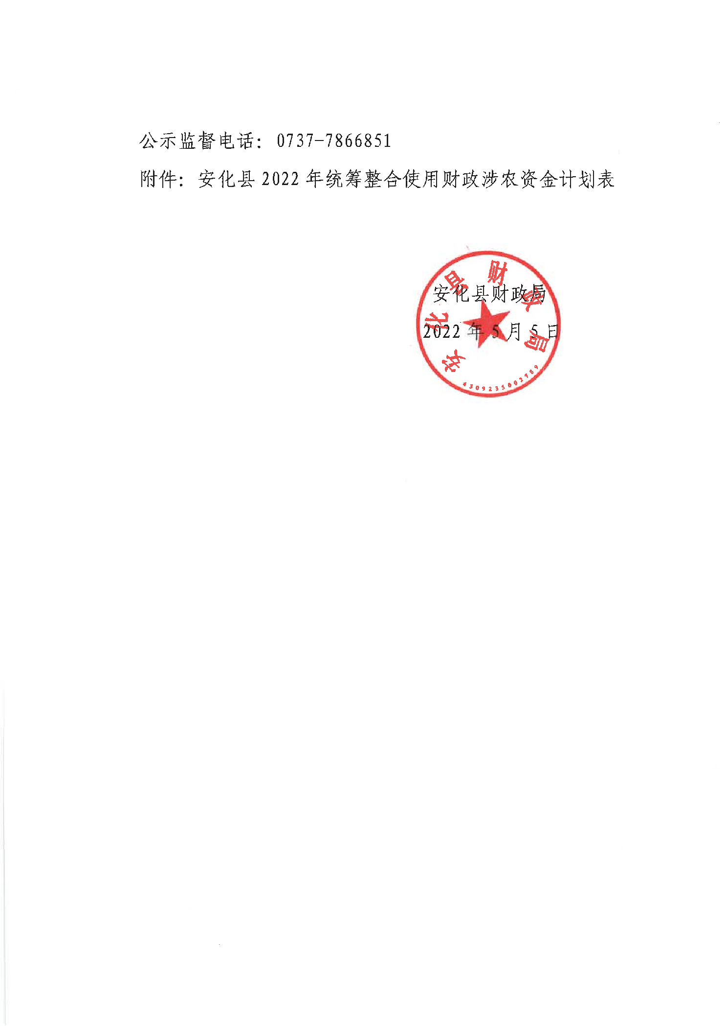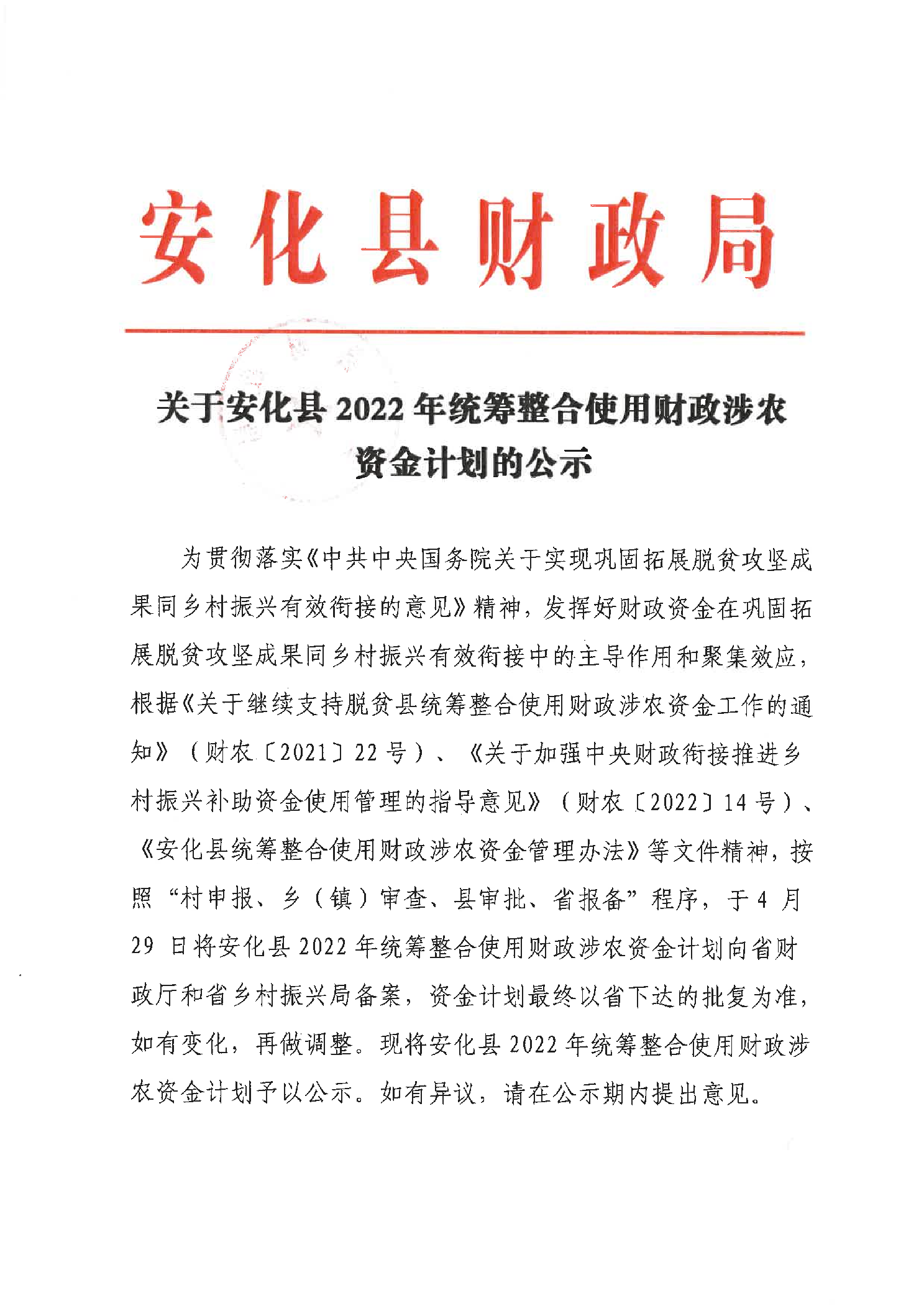关于安化县2022年统筹整合使用财政涉农资金计划的公示(4月)