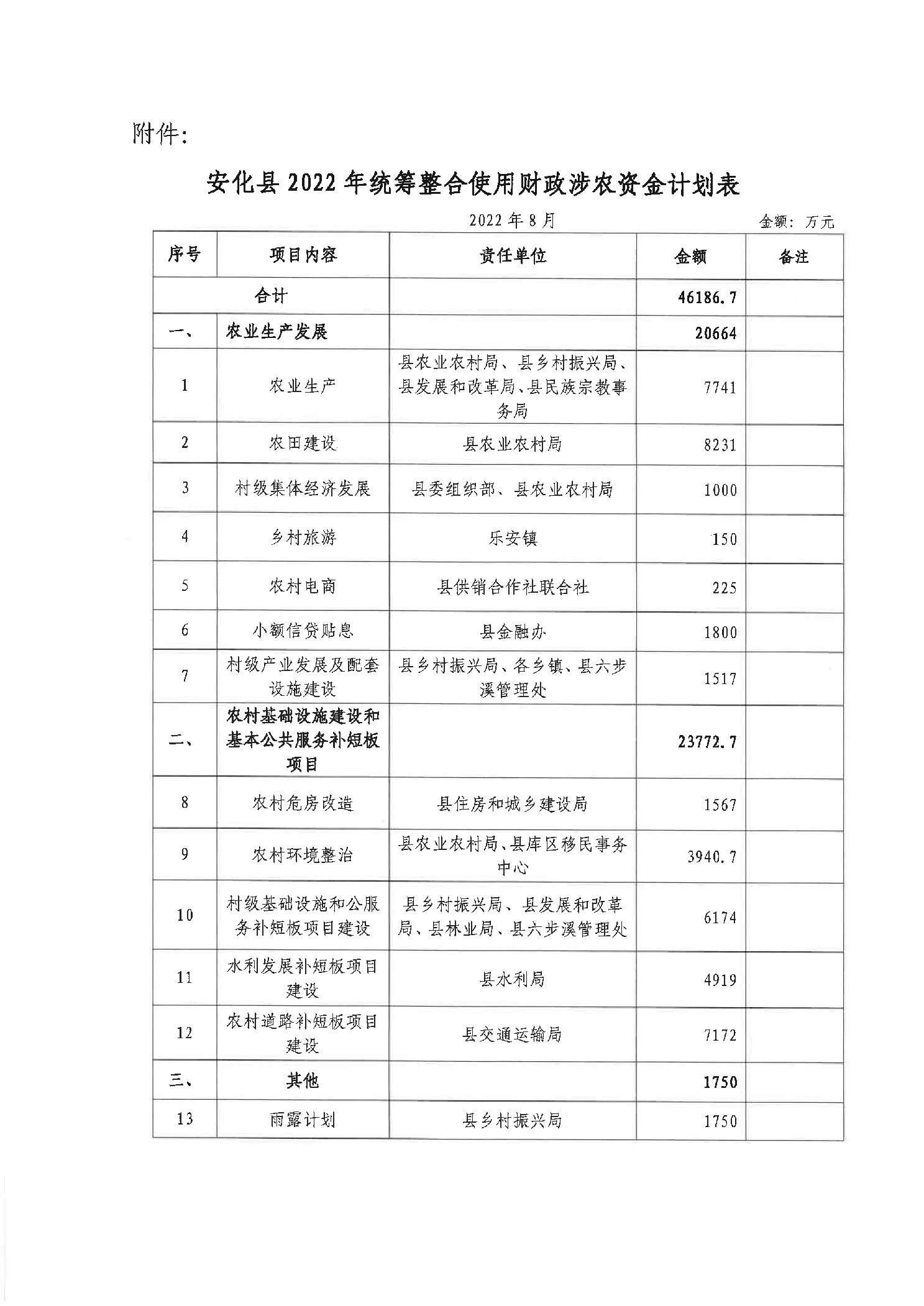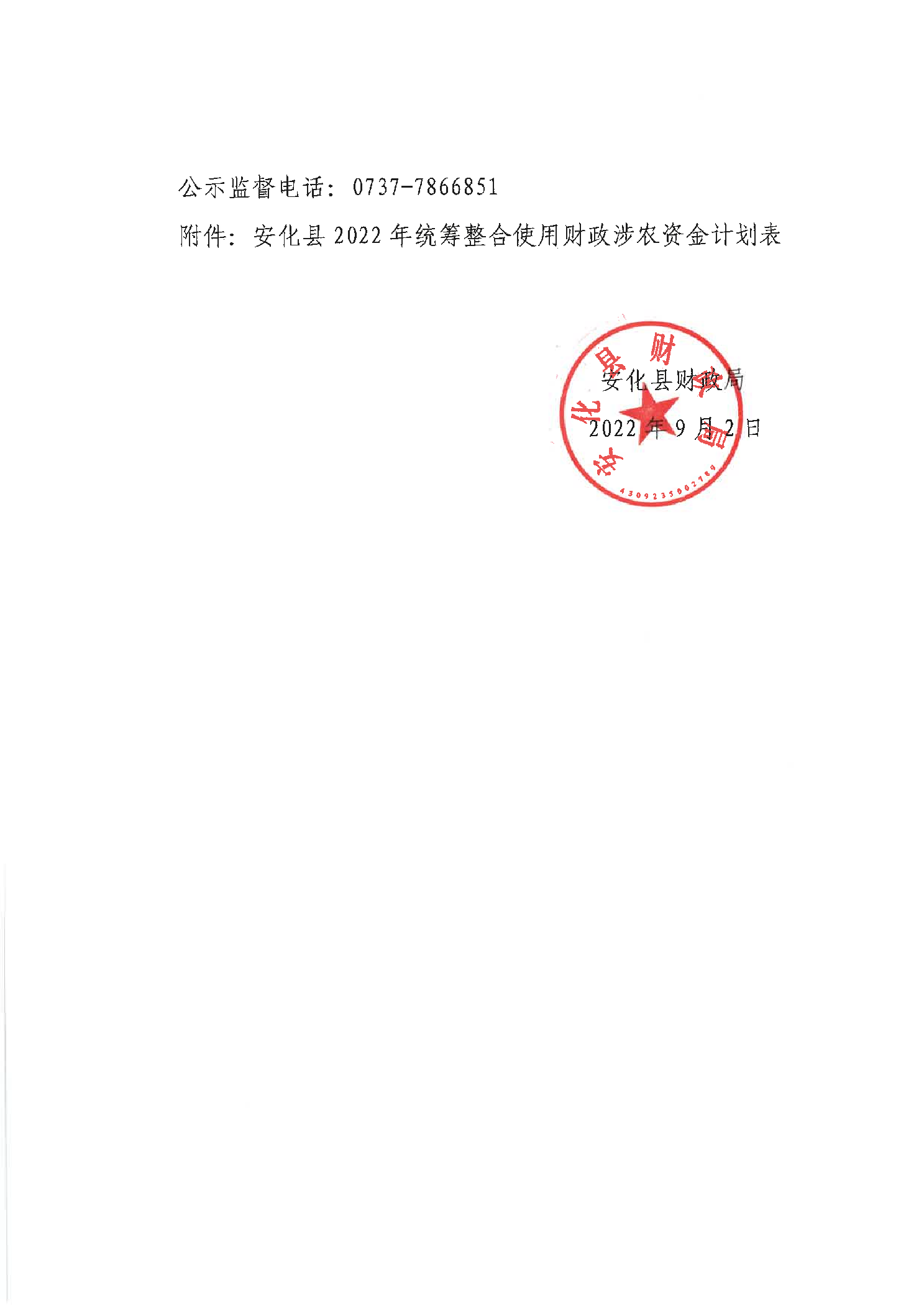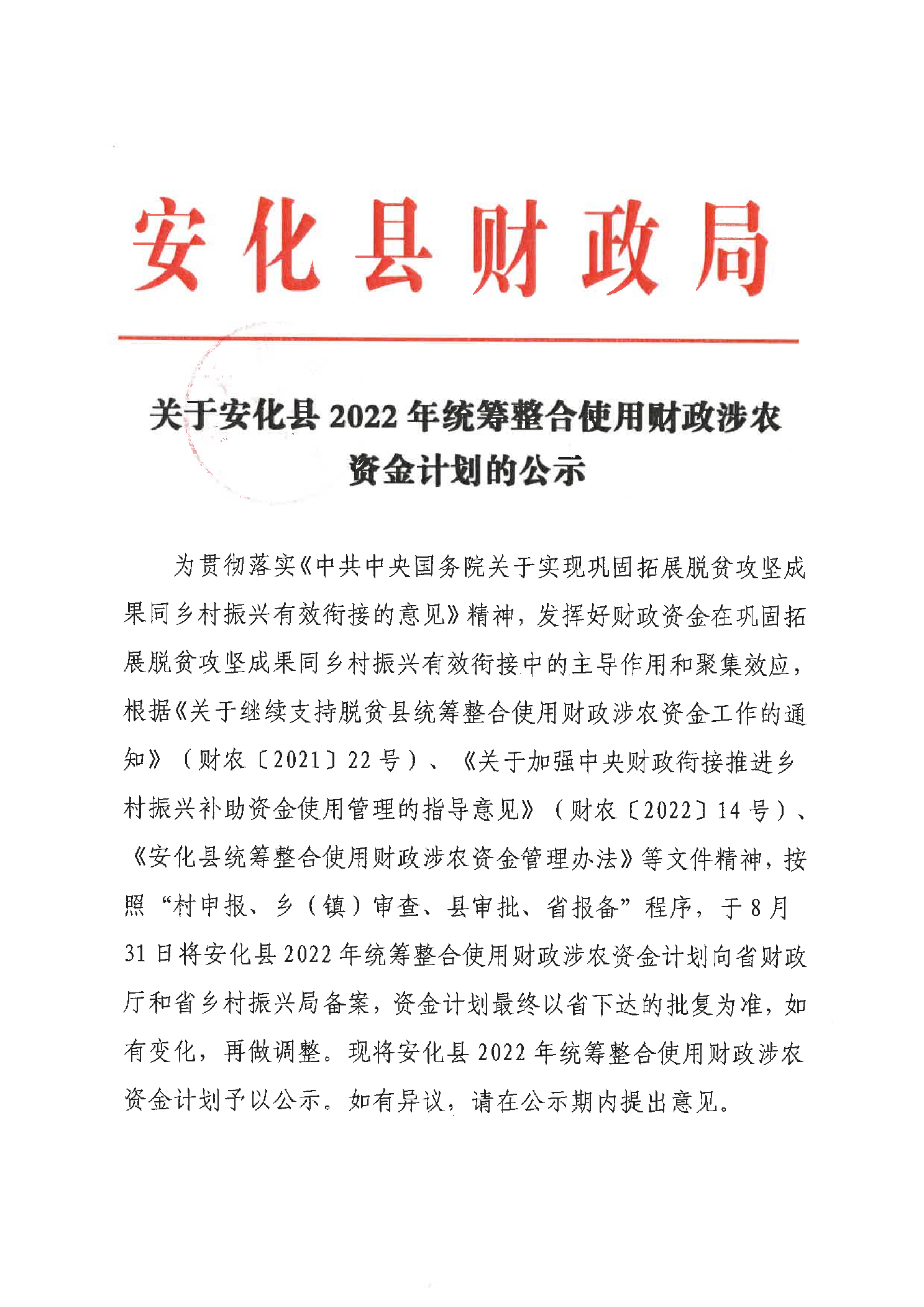 关于安化县2022年统筹整合使用财政涉农资金计划的公示(8月)
