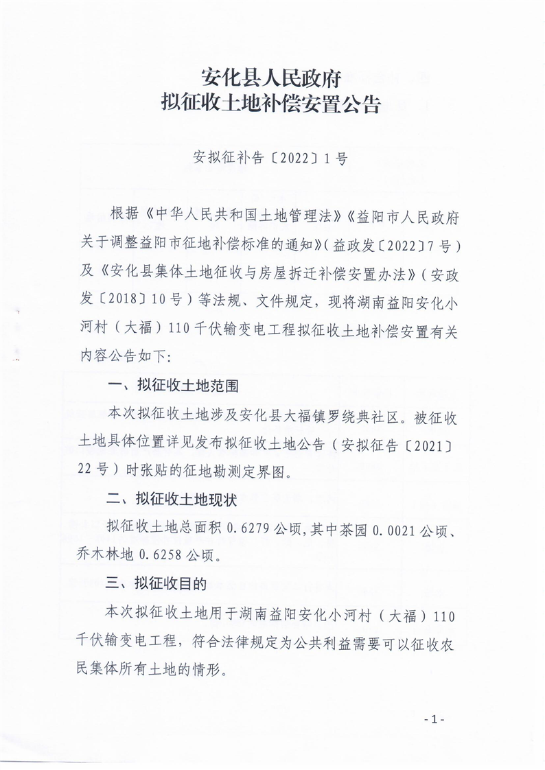 安化小河村(大福)110千伏输变电工程拟征收土地补偿安置公告