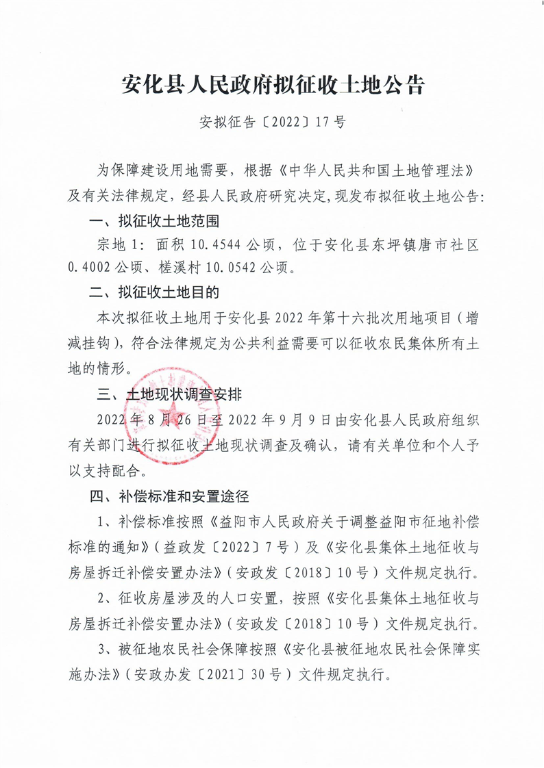 安化县2022年第十六批次用地项目(增减挂钩)拟征收公告