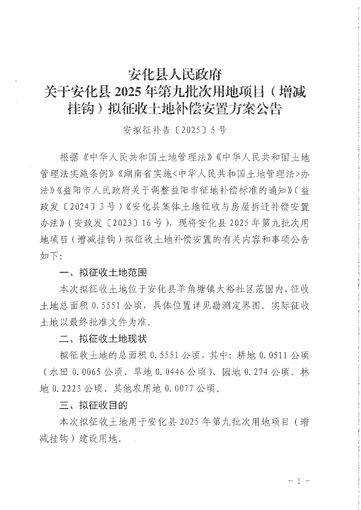 关于安化县2025年第九批次用地项目(增减挂钩)拟征收土地补偿安置方案公告