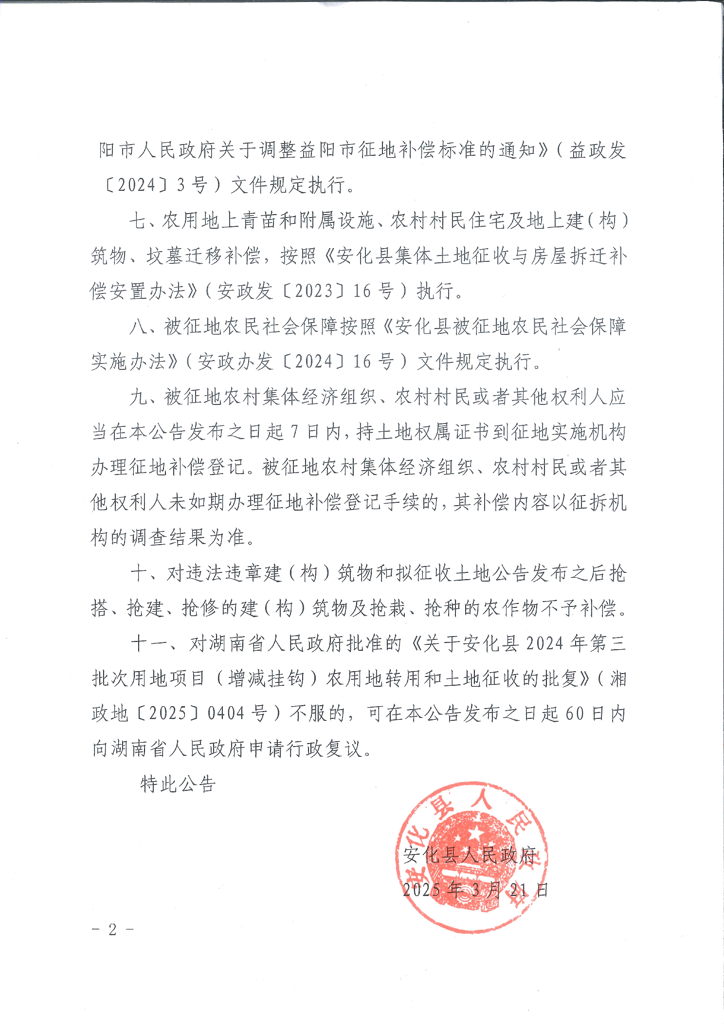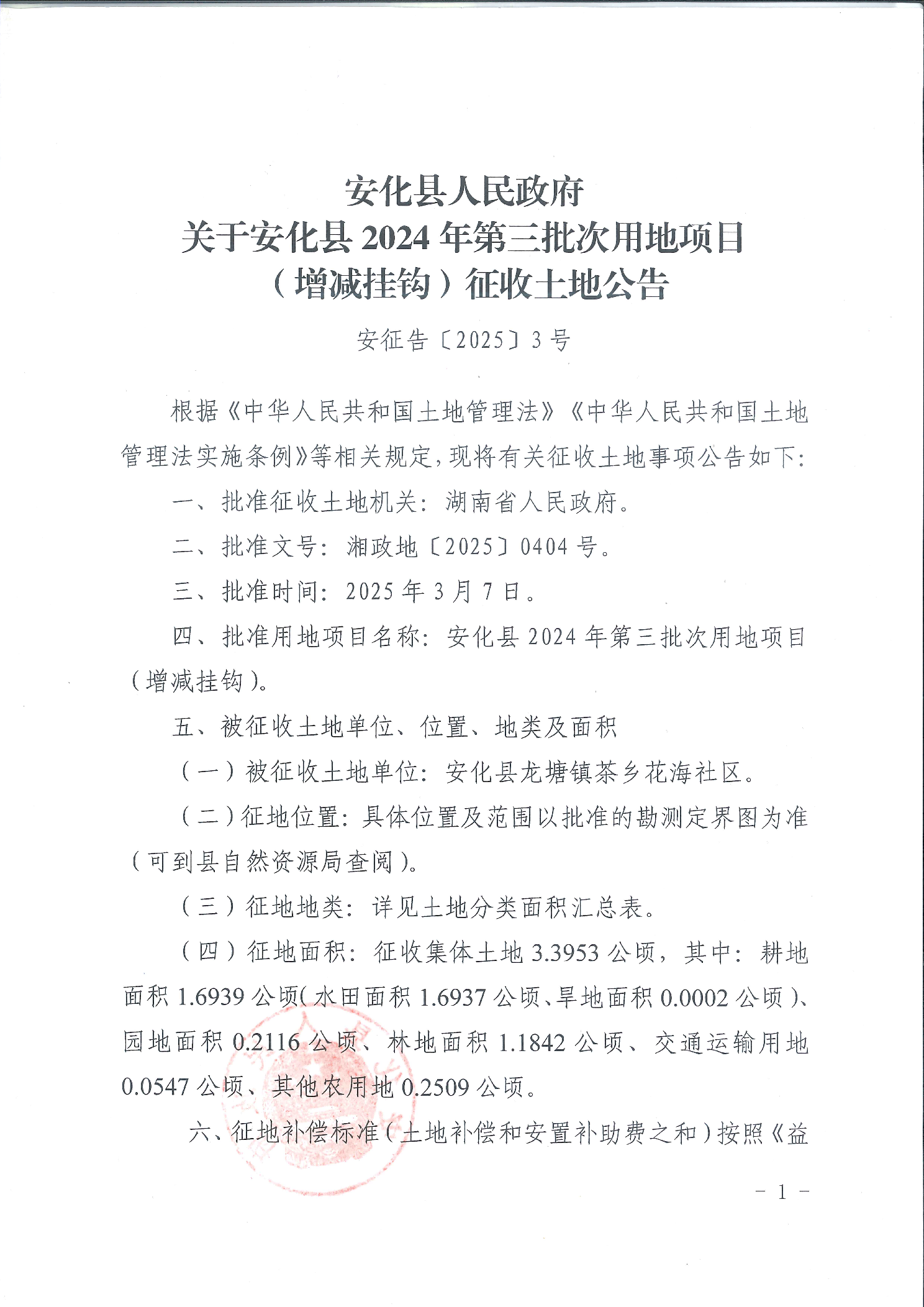 关于安化县2024年第三批次用地项目(增减挂钩)征收土地公告