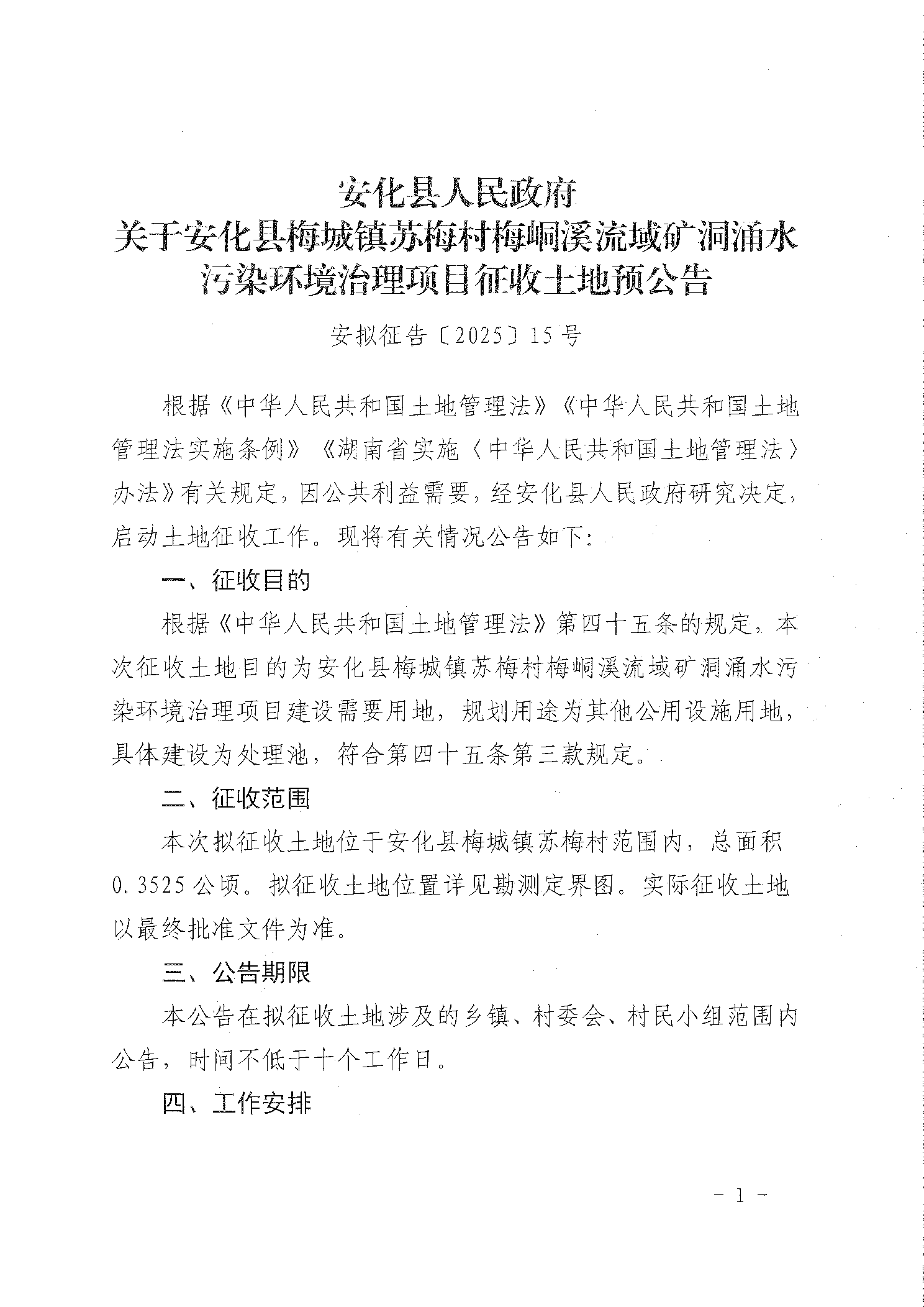 关于安化县梅城镇苏梅村梅峒溪流域矿洞涌水污染环境治理项目征收土地预公告