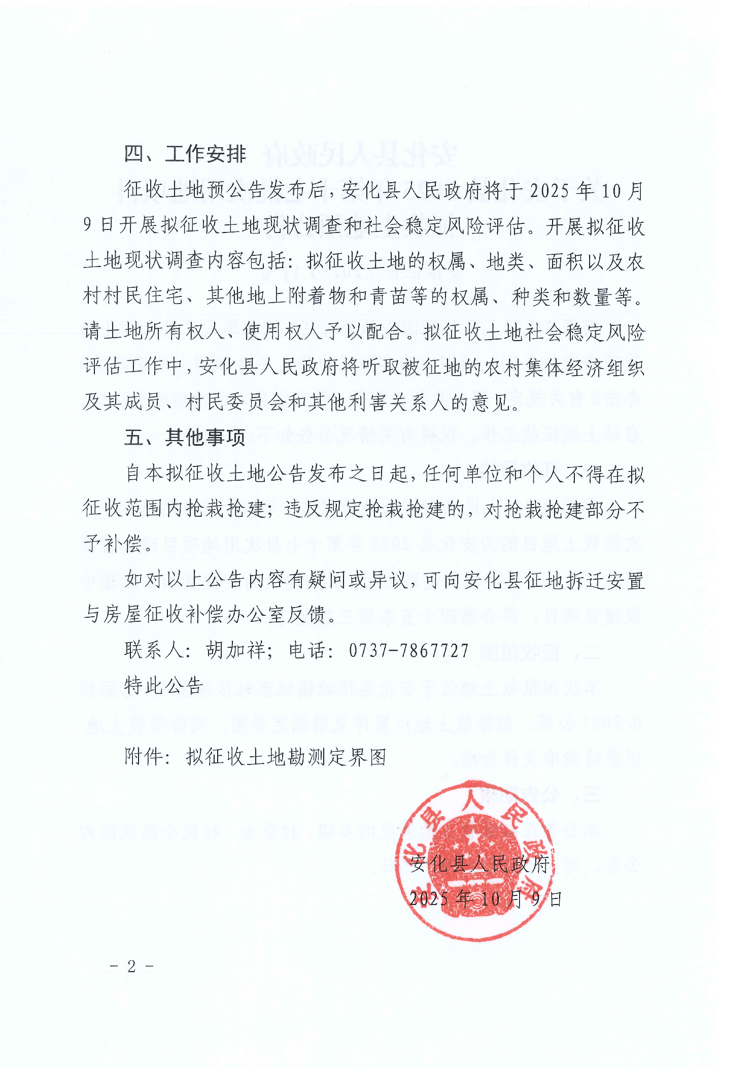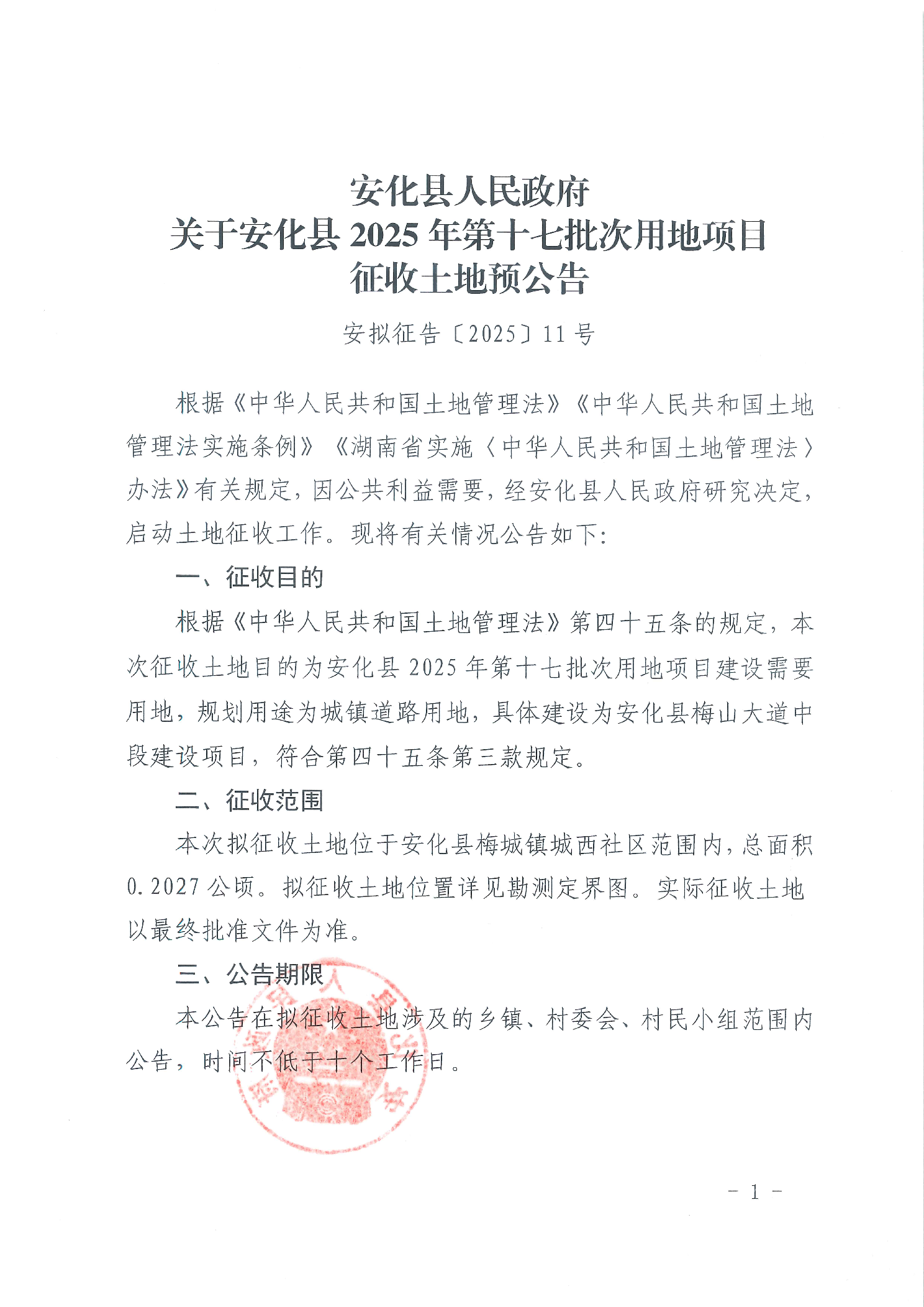 关于安化县2025年第十七批次用地项目征收土地预公告