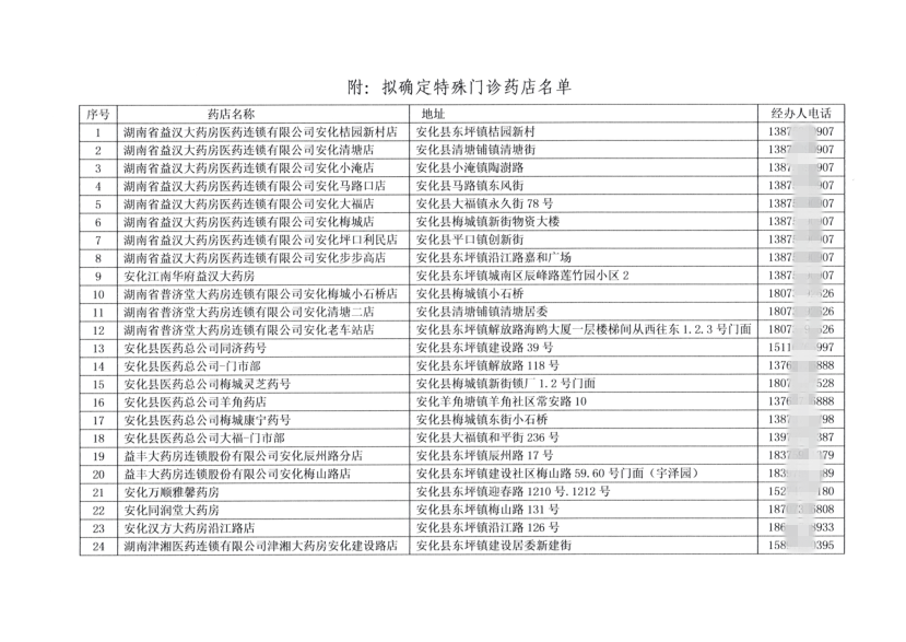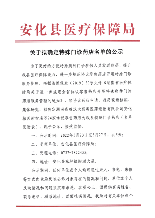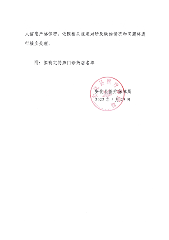 安化县医疗保障局关于确定我县特殊门诊药店的公示