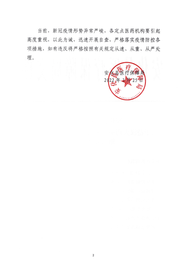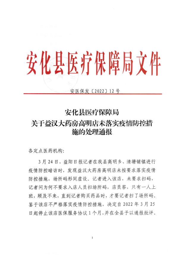 安化县医疗保障局关于益汉大药房高明店未落实疫情防控措施的处理通报