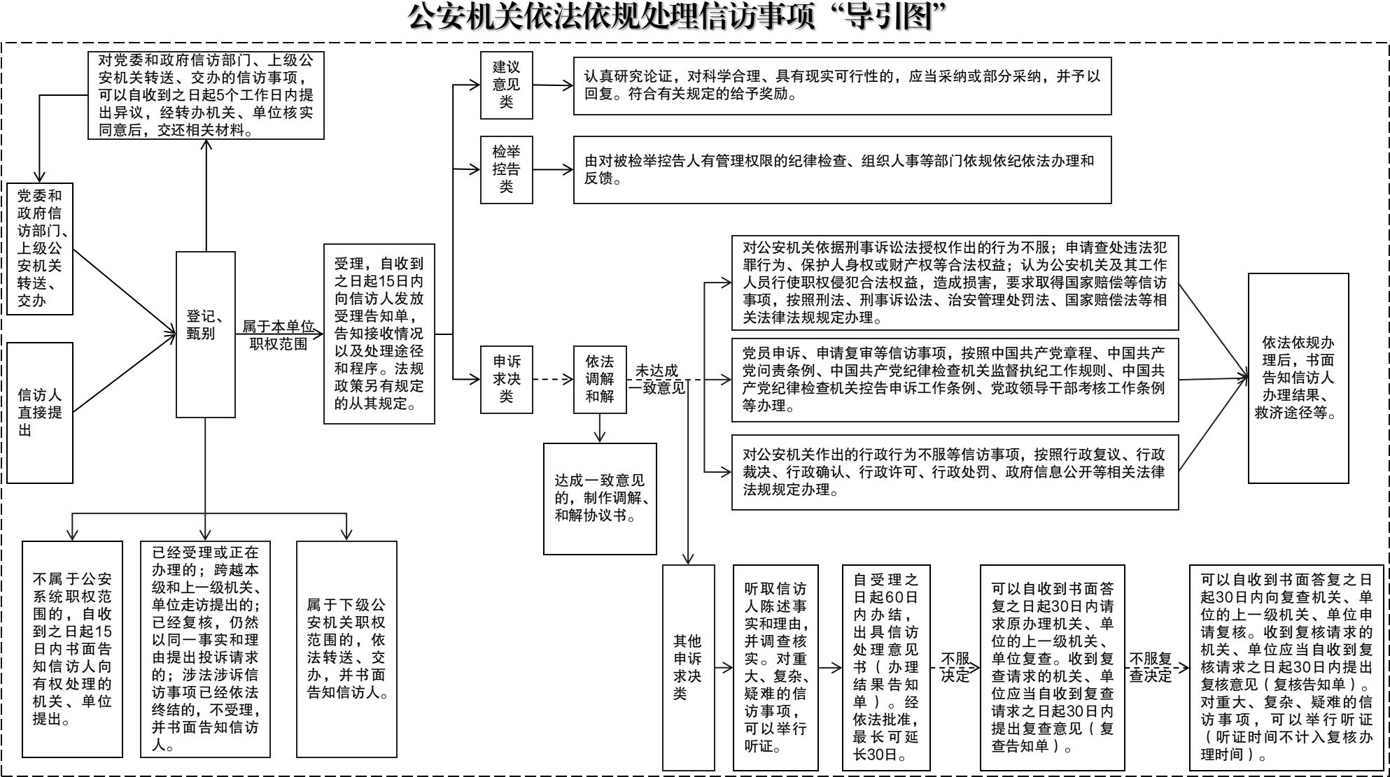 公安机关信访工作机构收到信访事项,应当予以登记甄别,对属于本机关职权范围的,应当自收到之日起15日内发放受理告知单,告知信访人接收情况以及处理途径和程序。对不属于公安系统职权范围内的信访事项,应当自收到之日起15日内书面告知信访人向有权处理的机关、单位提出。属于下级公安机关职权范围的,依法转送、交办,并书面告知信访人。对党委和政府信访部门、上级公安机关转送、交办的信访事项,可以自收到之日起5个工作日内提出异议,经转办机关、单位核实同意后,交还相关材料。书面包含纸质、短信、邮件、传真等形式。