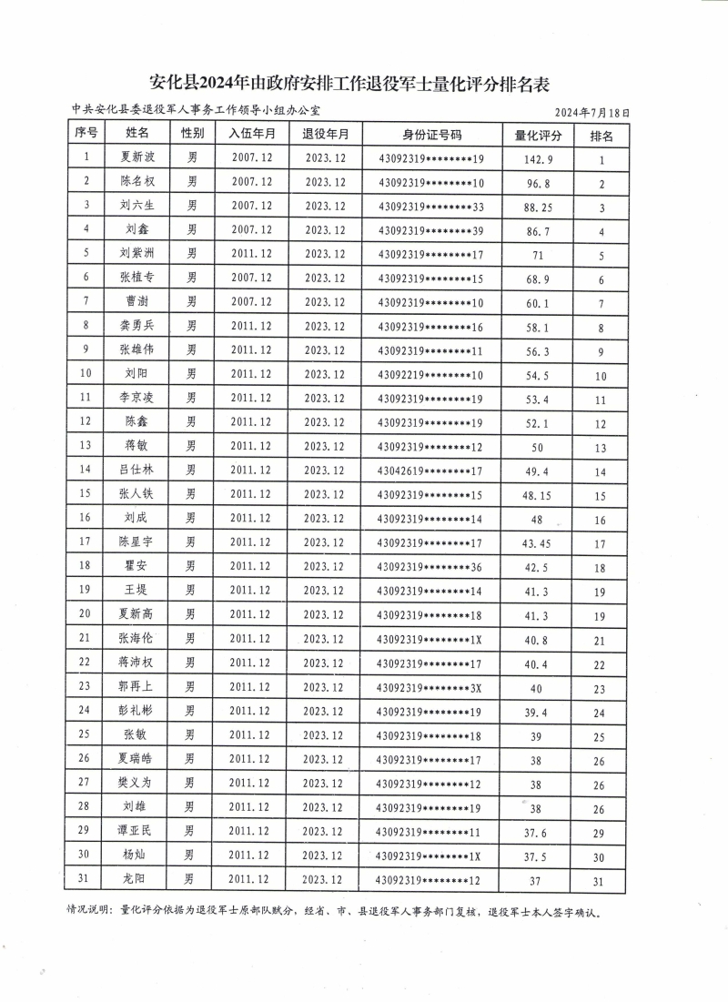安化县2024年由政府安排工作退役军士量化评分排名公示