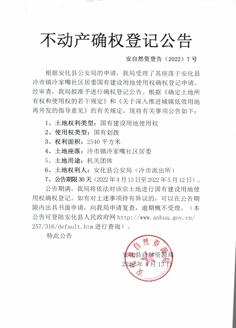 根据安化县公安局的申请,我局受理了其座落于安化县冷市镇冷家嘴社区居委国有建设用地使用权确权登记申请。经审查,我局拟准予进行确权登记公告。根据《确定土地所有权和使用权的若干规定》和《关于深入推进城镇低效用地再开发的指导意见》的有关规定,现将有关事项公告如下: