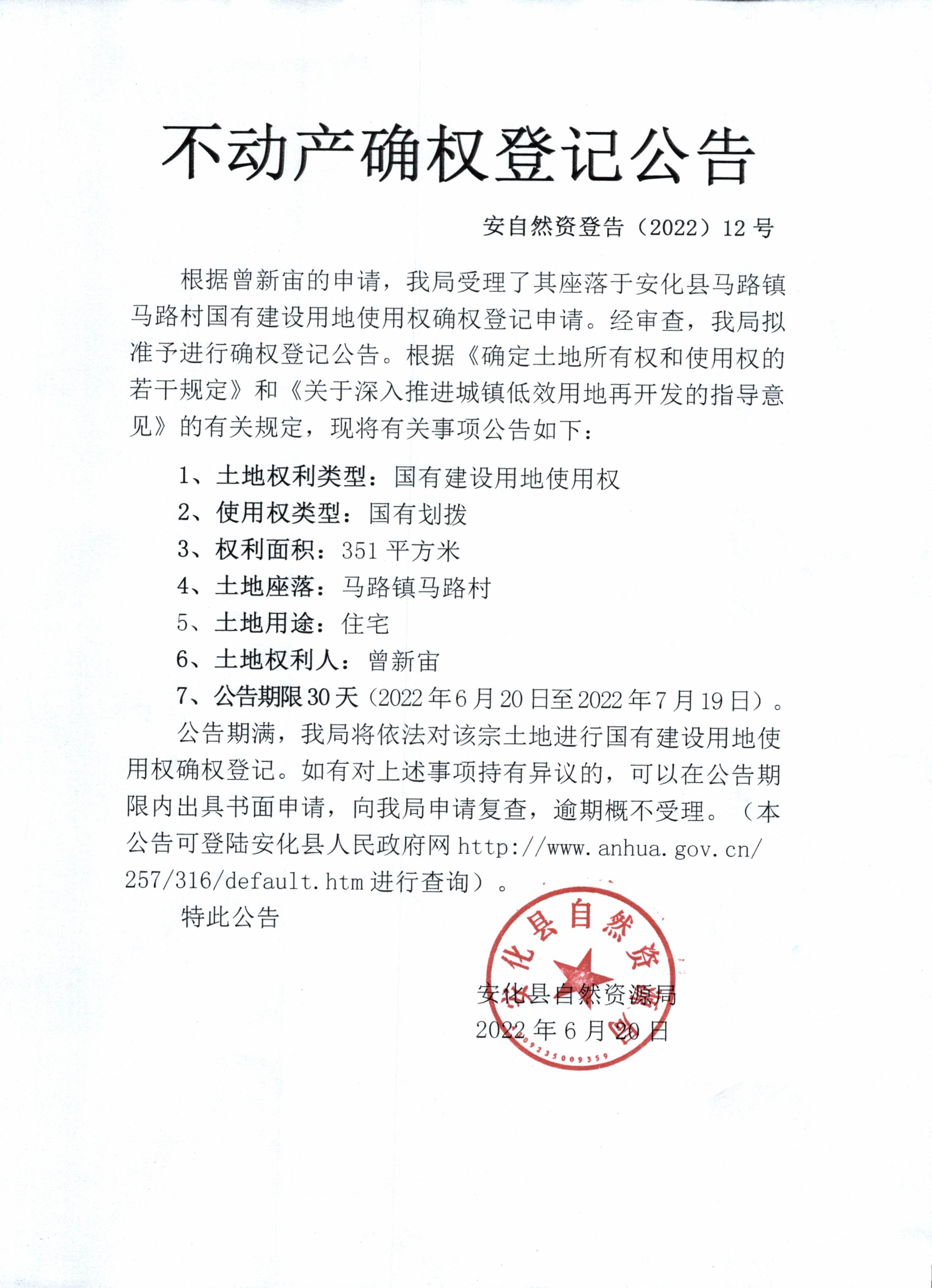根据曾新宙的申请,我局受理了其座落于安化县马路镇马路村国有建设用地使用权确权登记申请。经审查,我局拟准予进行确权登记公告。根据《确定土地所有权和使用权的若干规定》和《关于深入推进城镇低效用地再开发的指导意见》的有关规定,现将有关事项公告如下: