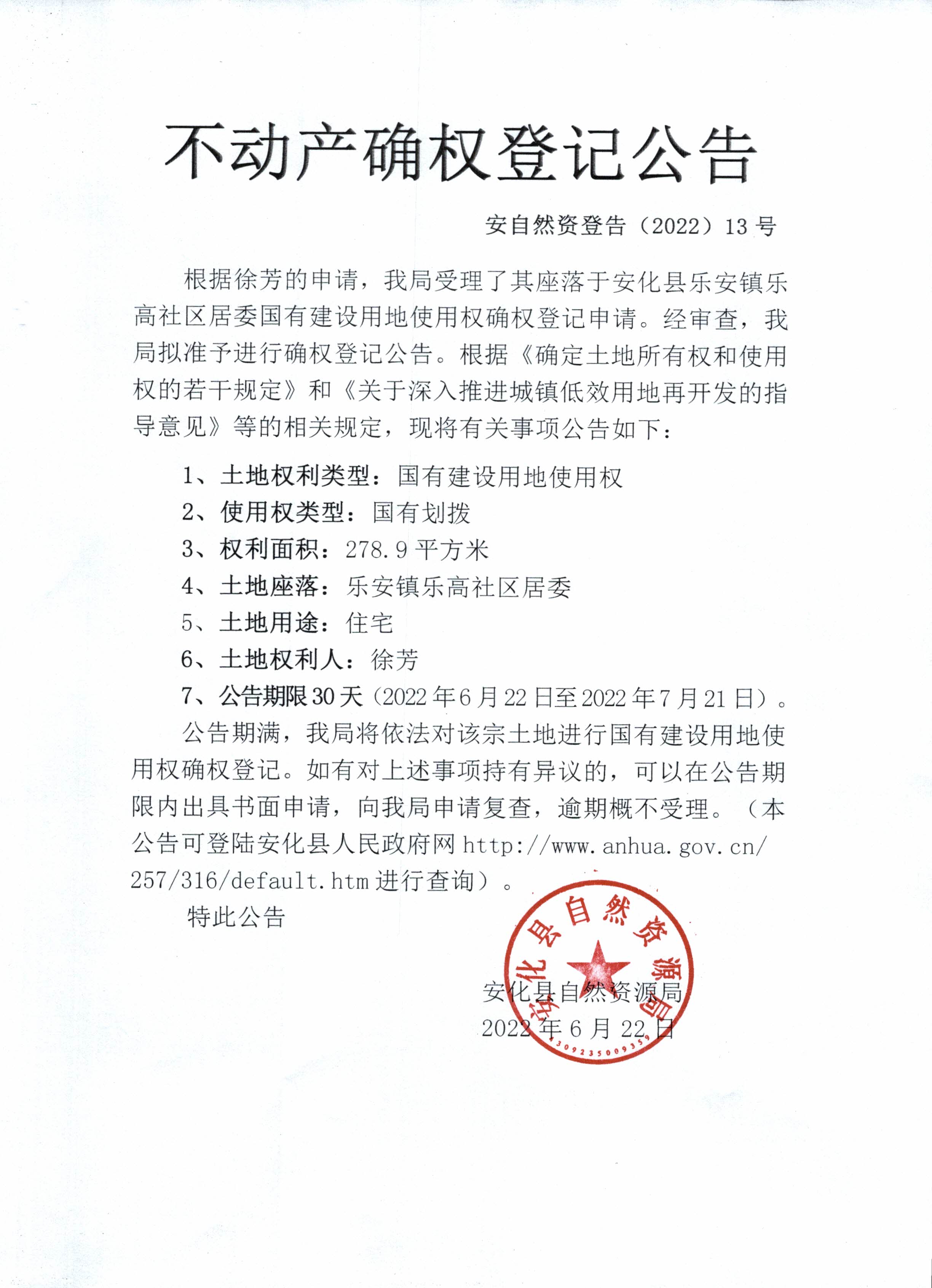 根据徐芳的申请,我局受理了其座落于安化县乐安镇乐高社区居委国有建设用地使用权确权登记申请。经审查,我局拟准予进行确权登记公告。根据《确定土地所有权和使用权的若干规定》和《关于深入推进城镇低效用地再开发的指导意见》等的相关规定,现将有关事项公告如下: