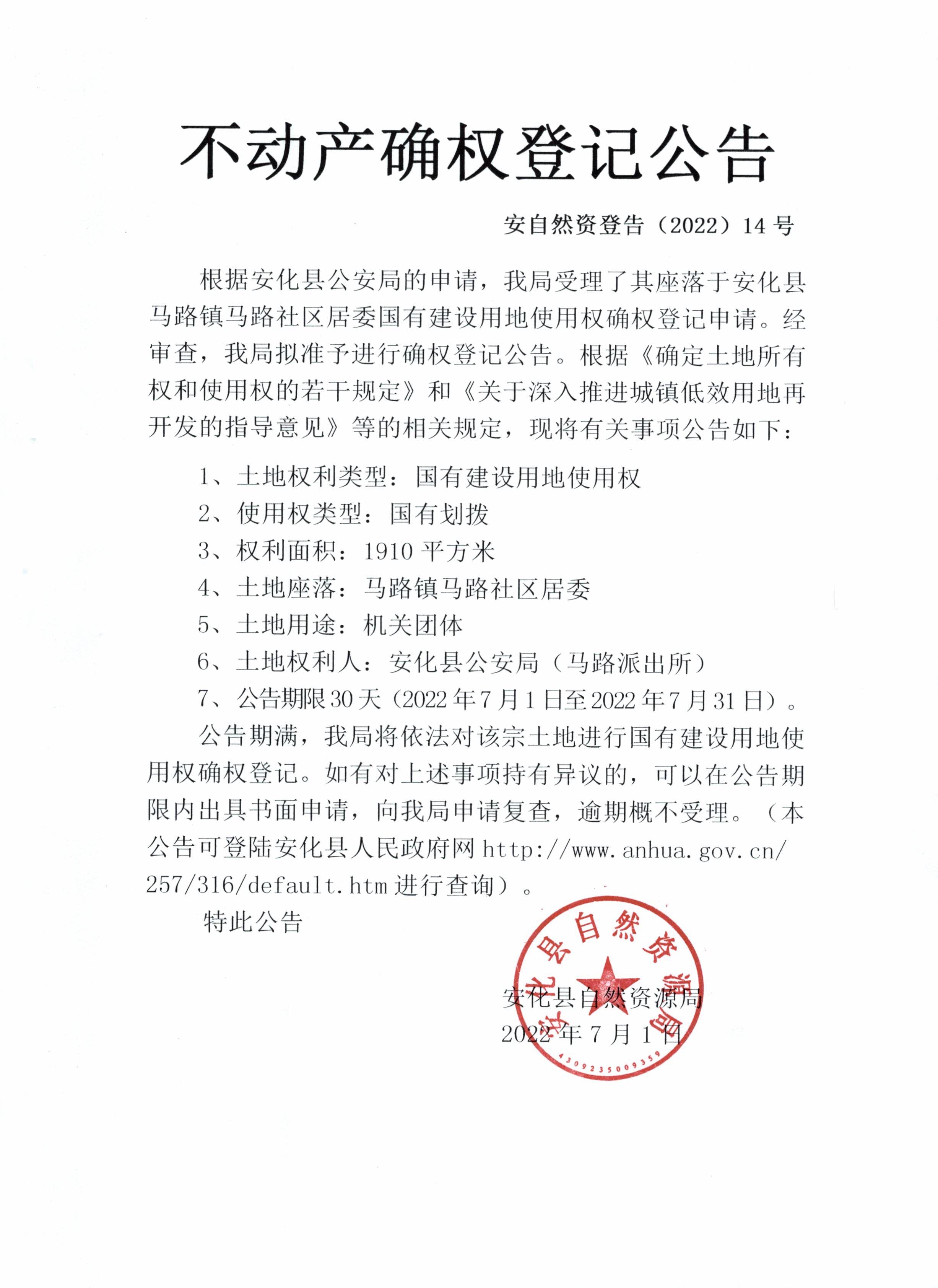根据安化县公安局的申请,我局受理了其座落于安化县马路镇马路社区居委国有建设用地使用权确权登记申请。经审查,我局拟准予进行确权登记公告。根据《确定土地所有权和使用权的若干规定》和《关于深入推进城镇低效用地再开发的指导意见》等的相关规定,现将有关事项公告如下: