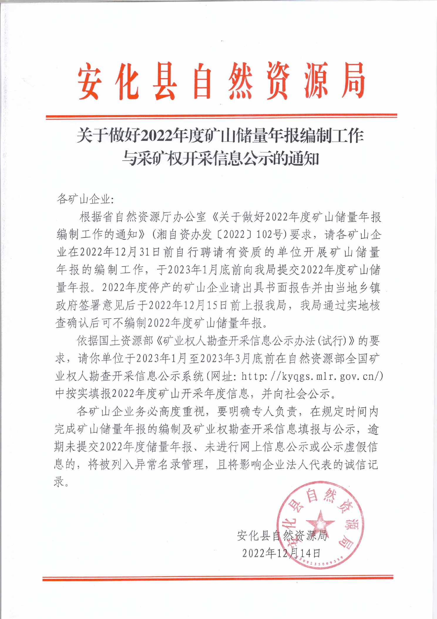关于做好2022年度矿山储量年报编制工作与采矿权开采信息公示的通知