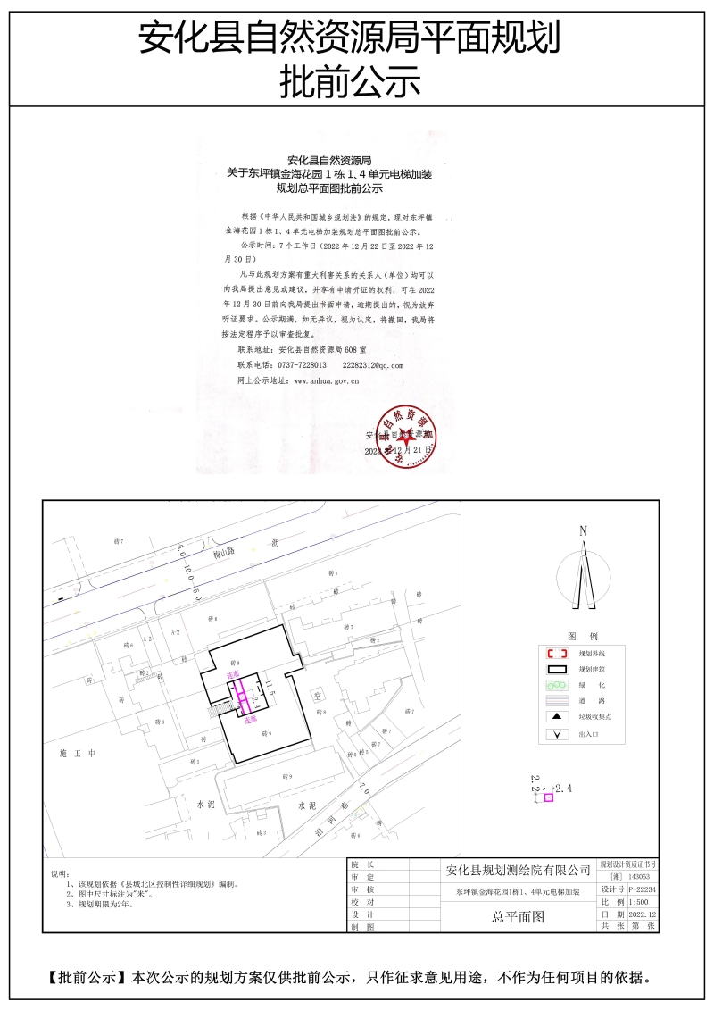 关于东坪镇金海花园1栋1、4单元电梯加装规划总平面图批前公示
