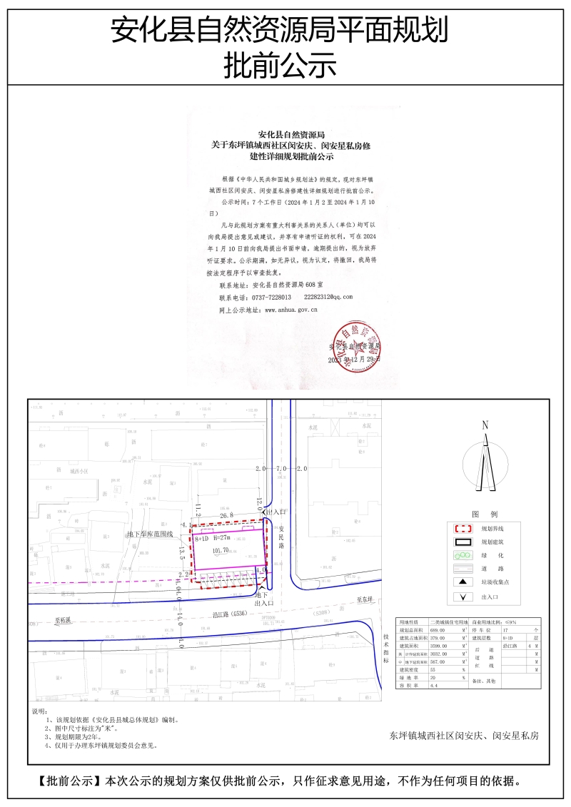关于东坪镇城西社区闵安庆、闵安星私房修建性详细规划批前公示