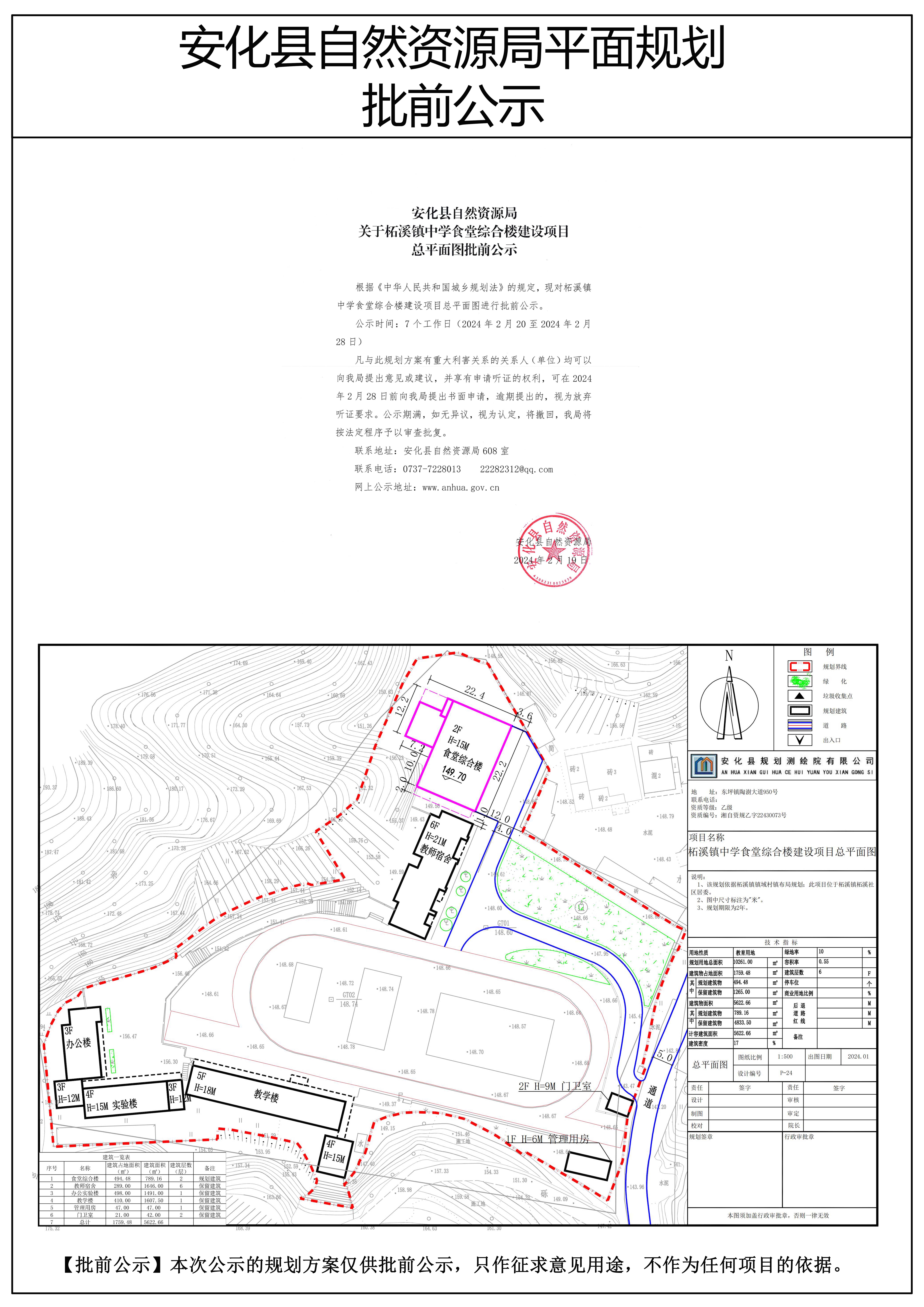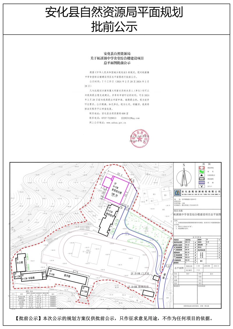 关于柘溪镇中学食堂综合楼建设项目总平面图批前公示