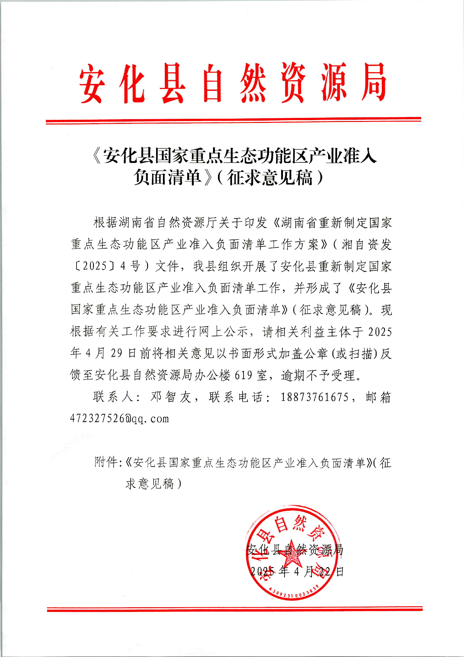 《安化县国家重点生态功能区产业准入 负面清单》(征求意见稿)
