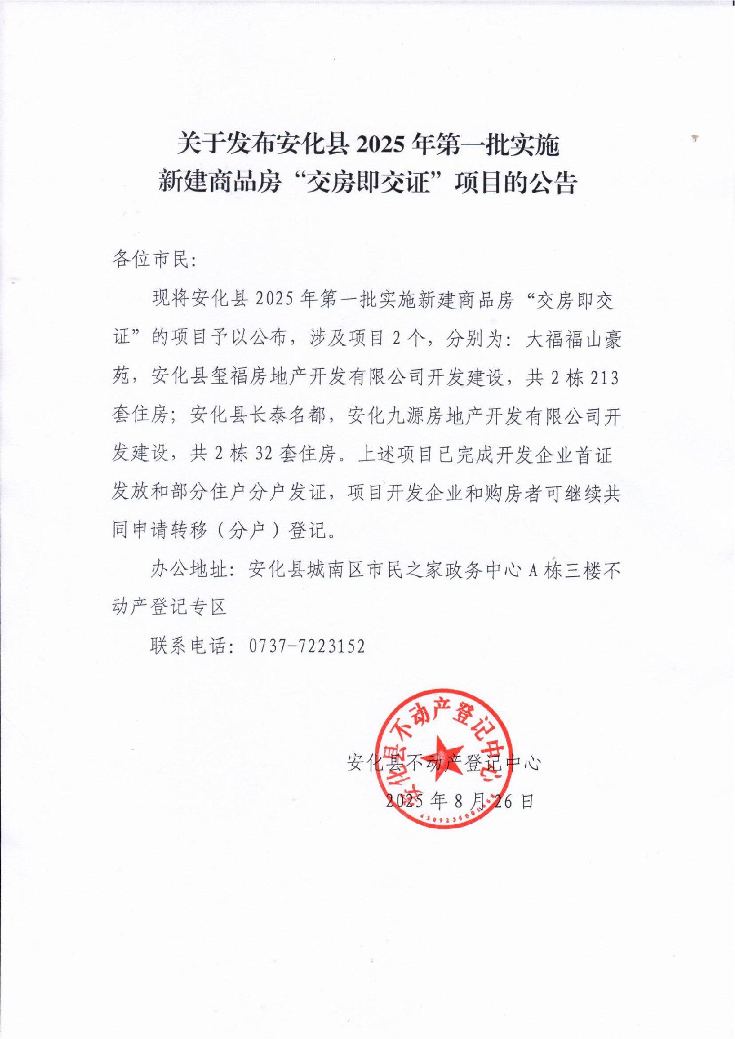 关于发布安化县2025年第一批实施新建商品房“交房即交证”项目的公告