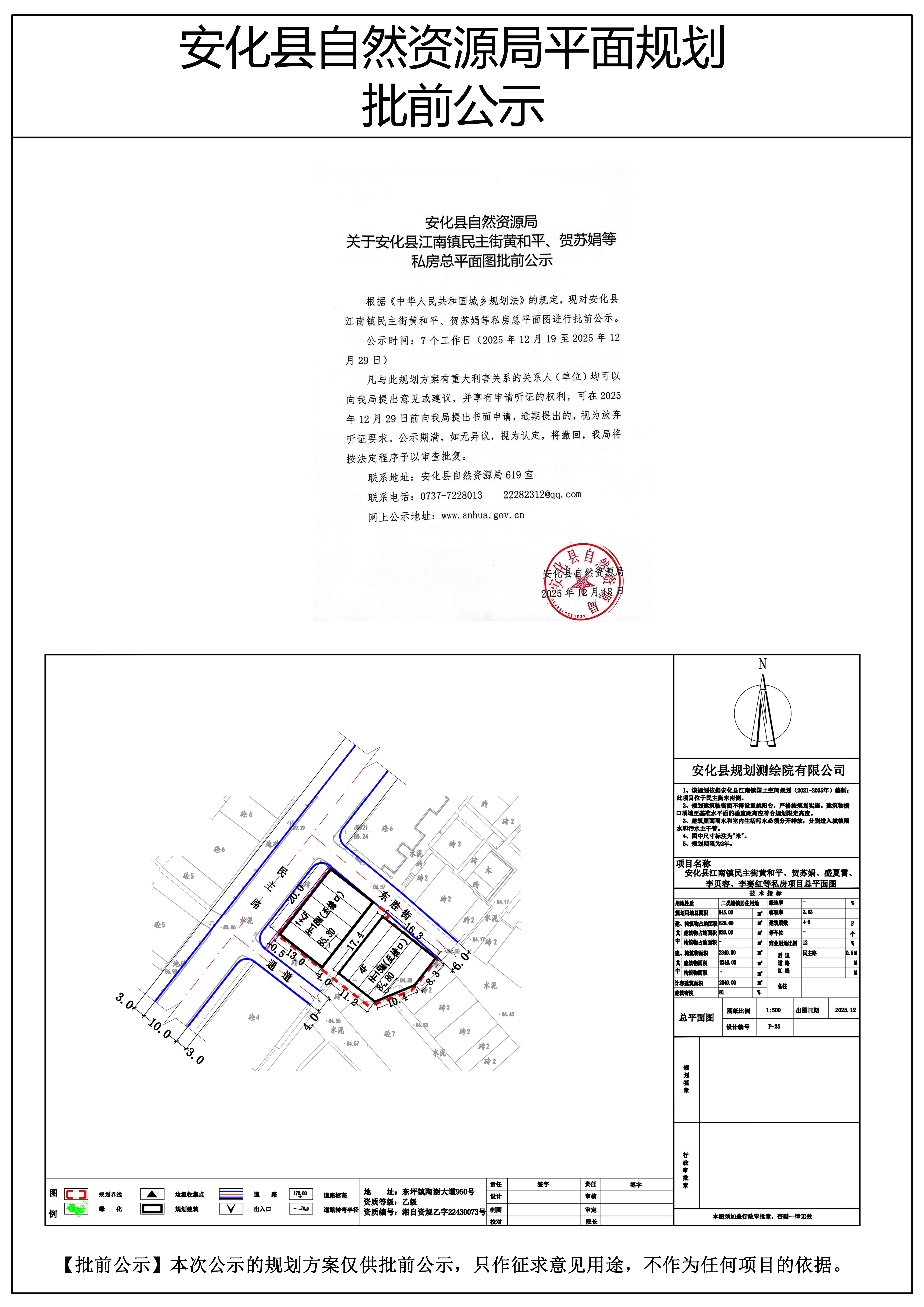 安化县江南镇民主街黄和平、贺苏娟等私房总平面图批前公示