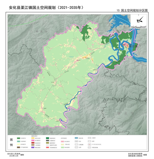 根据国土空间总体格局,结合地域特征和经济社会发展水平,按照全域全覆盖、不交叉、不重叠的原则,衔接落实安化县国土空间总体规划分区,将渠江镇镇域划分为生态保护区、生态控制区、农田保护区,以及城镇发展区、乡村发展区五个一级分区,实行差异管控。