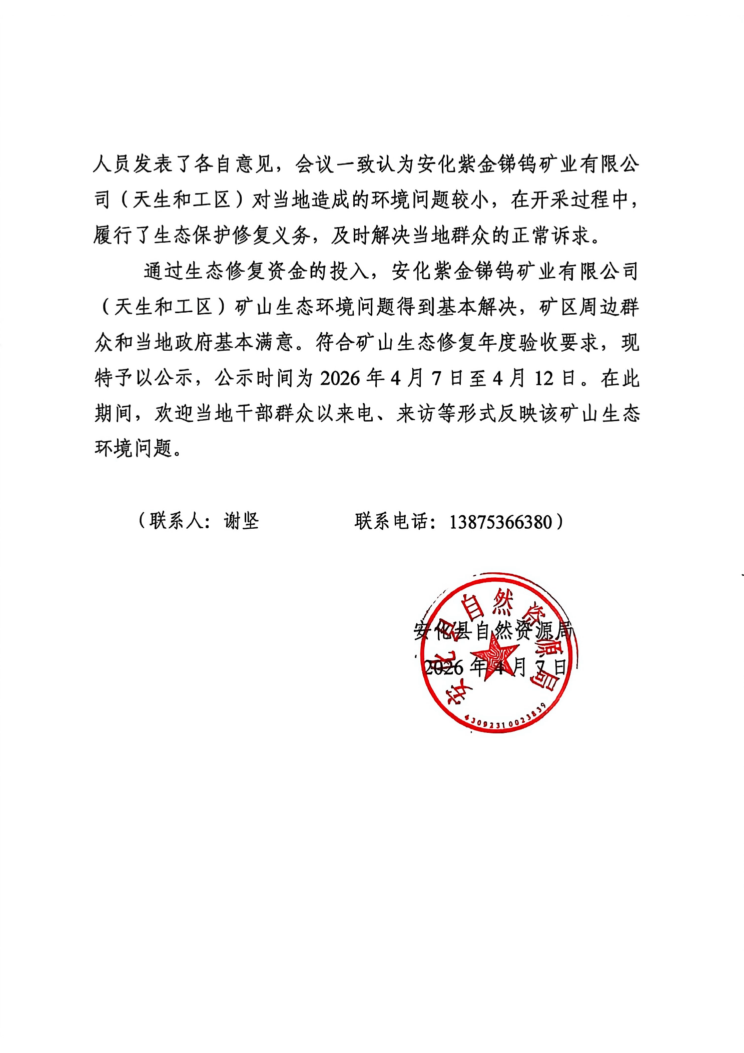 安化紫金锑钨矿业有限公司(天生和工区)矿山生态保护修复年度验收公示