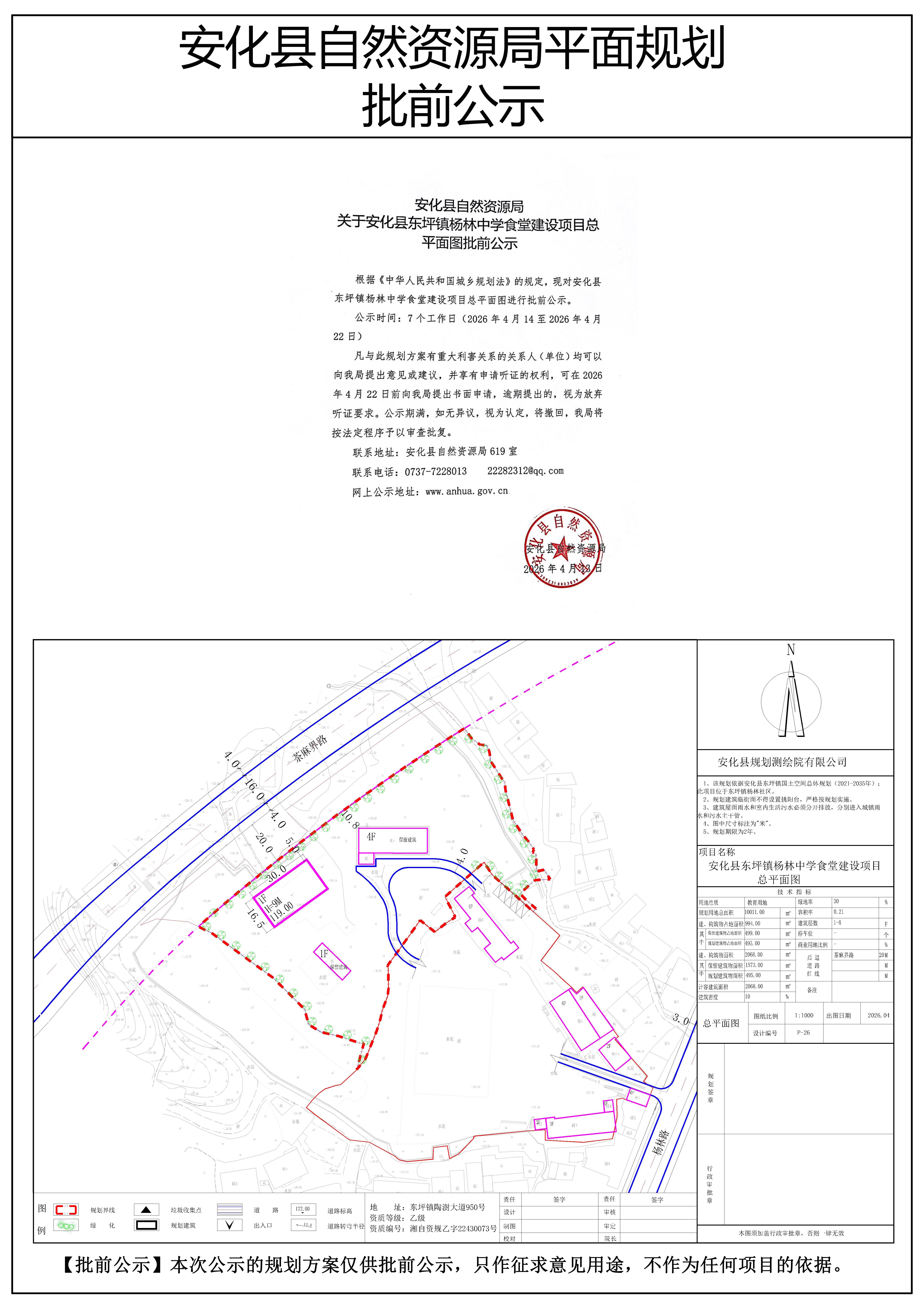 安化县东坪镇杨林中学食堂建设项目总平面图批前公示