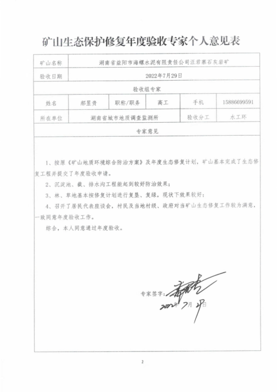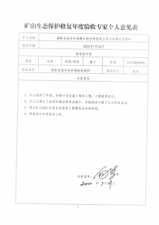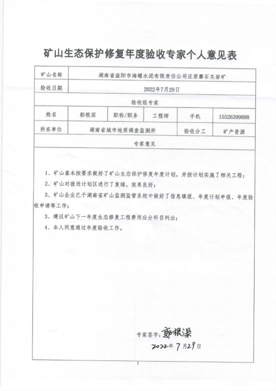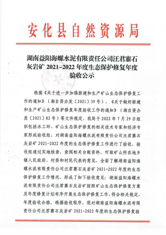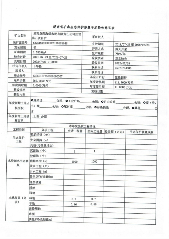 湖南益阳海螺水泥有限责任公司汪君寨石灰岩矿2021-2022年度生态保护修复年度