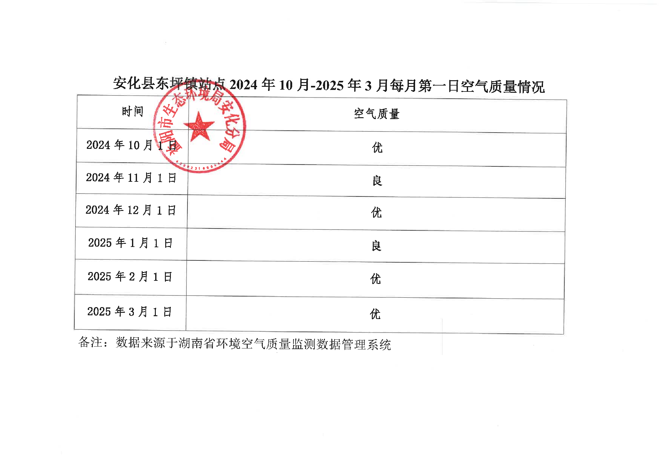安化县东坪镇站点2024年10月-2025年3月每月第一日空气质量情况