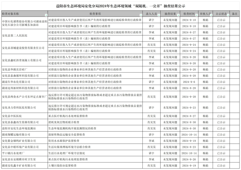 益阳市生态环境局安化分局2024年 生态环境领域“双随机、一公开”抽查结果公示