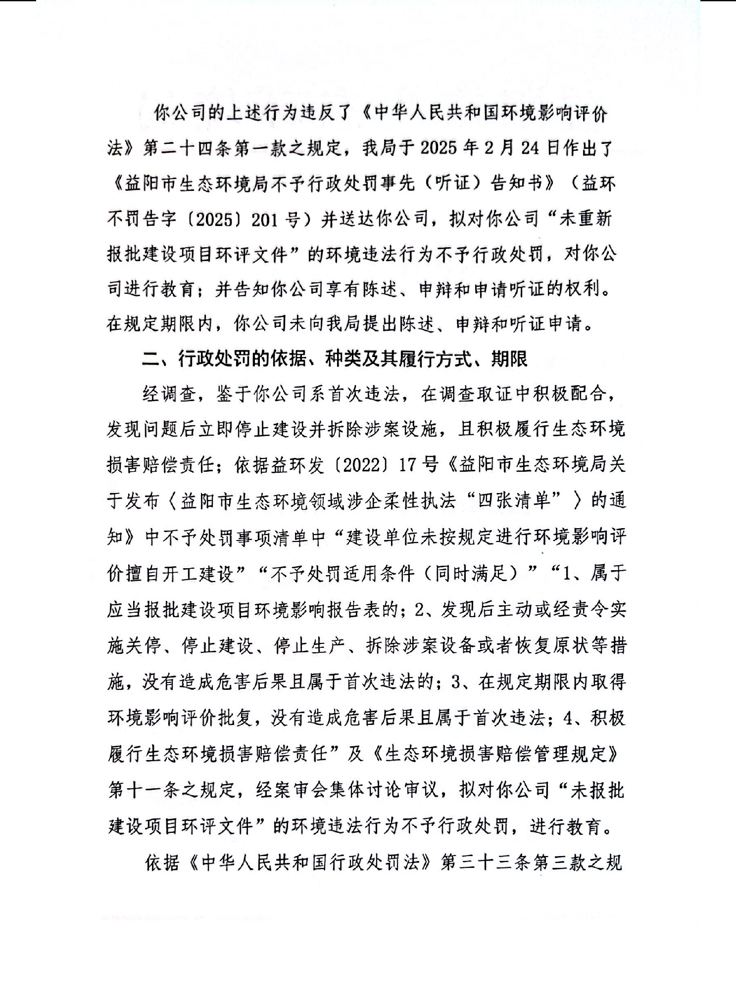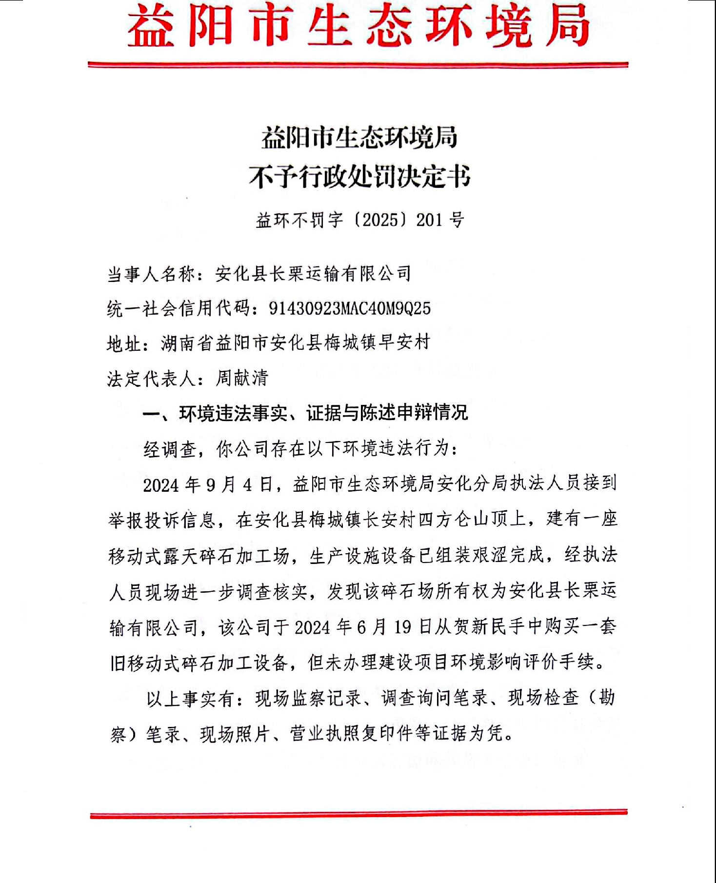 不予行政处罚决定书益环不罚字【2025】201号 长栗运输有限公司