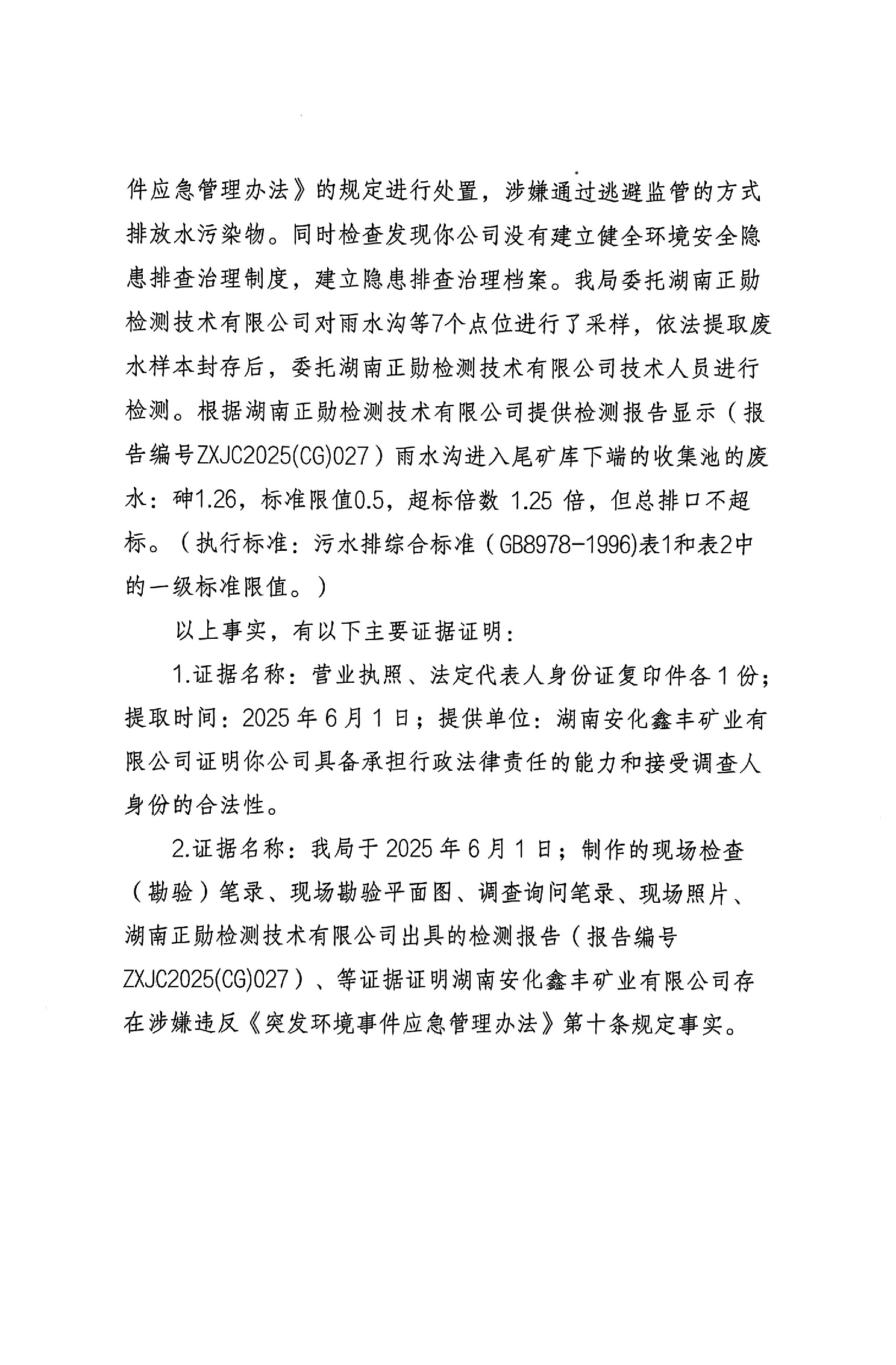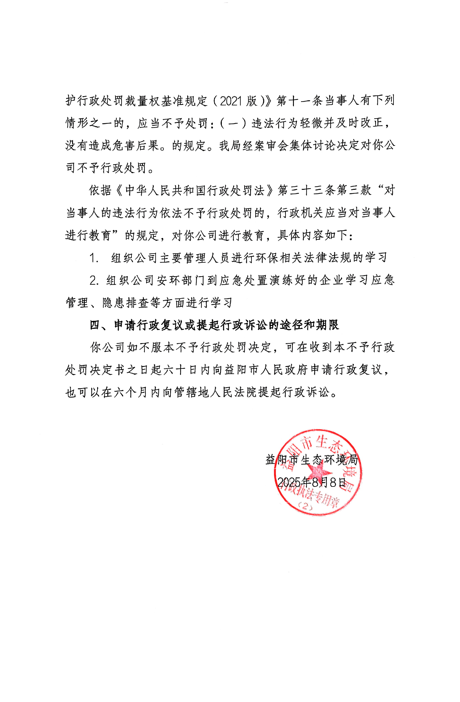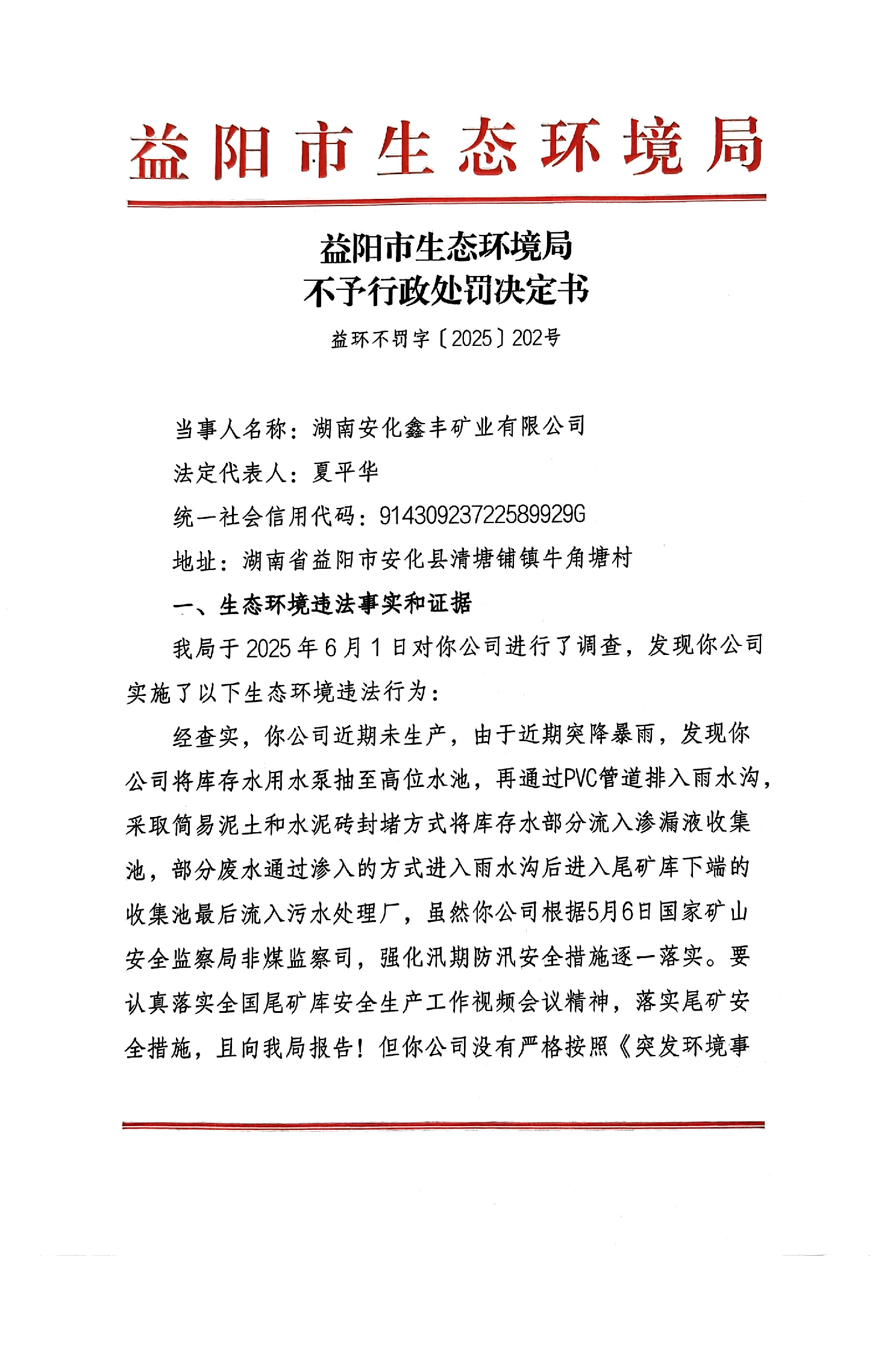 不予行政处罚决定书 益环不罚字【2025】202号 安化鑫丰矿业有限公司