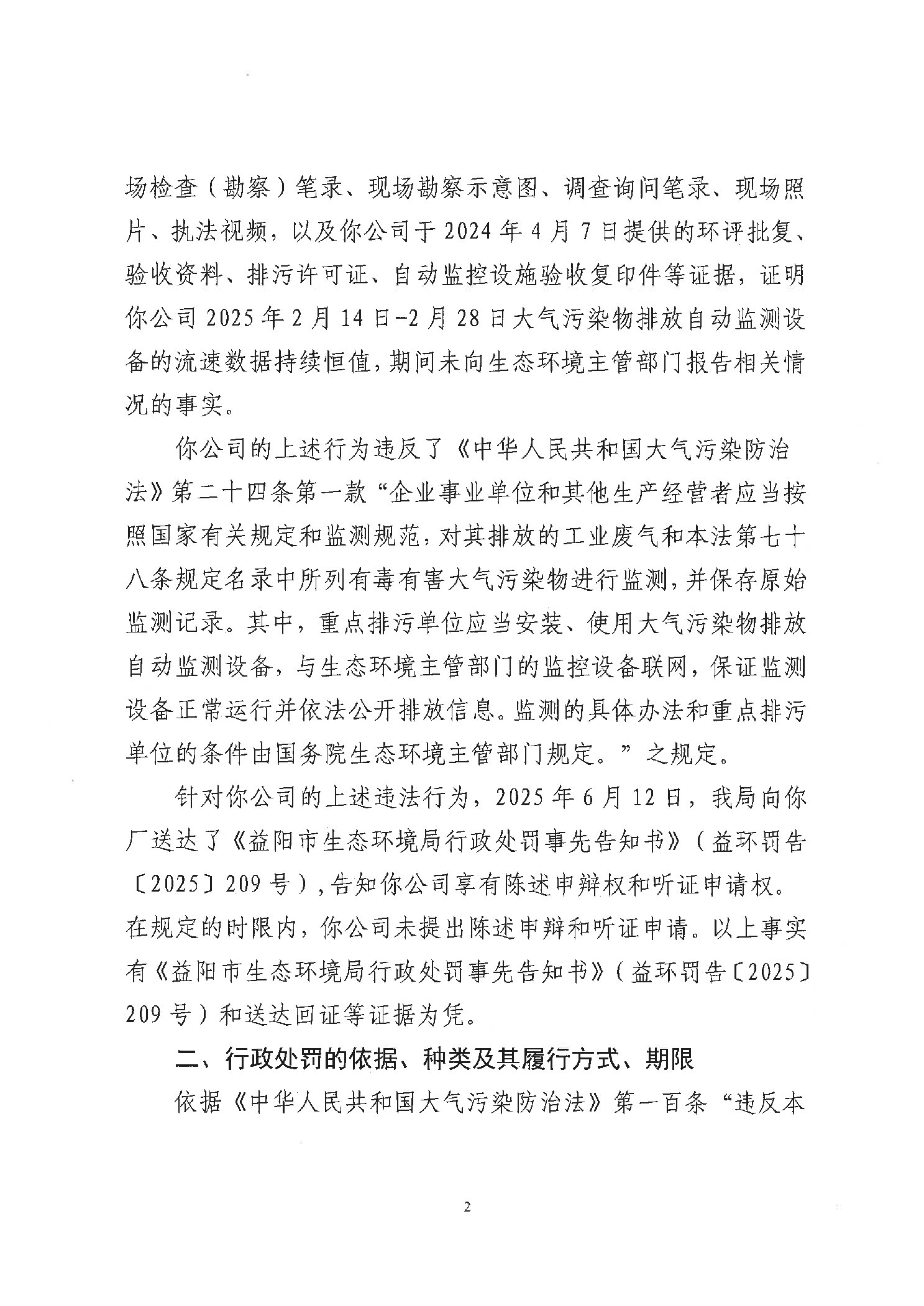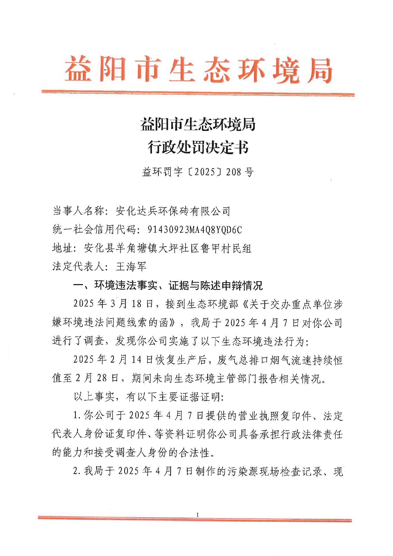 行政处罚决定书 益环罚字【2025】208号 安化达兵环保砖有限公司